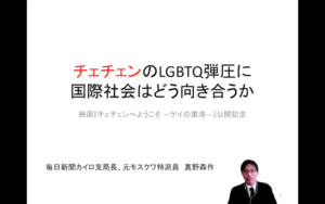 『チェチェンへようこそ ―ゲイの粛清―』公開を記念して、3/3(木)に真野森作さんオンライントーク「チェチェンの“ゲイ狩り”に国際社会はどう向き合うか」を開催しました。毎日新聞カイロ支局長の真野さんはロシアを長らく取材されており、本作の配給会社から「パンフレットの代わりに」と推薦された書籍『ポスト・プーチン論序説「チェチェン化」するロシア』の著者でもあります。チェチェンを知るためにはロシアを知らねばならない、そのことがよくわかる内容です。そして奇しくもロシアのウクライナ侵攻で世界が揺れているタイミングでの開催となりました。侵攻直前までウクライナで取材をされていた真野さん、街の様子や人々の声を伝えるとともに、なぜ“プーチンの戦争”は起きたのか?その思いや野心、老いなどについて考察し、ロシアの世界での立ち位置を説明されました。そしてそんなロシア=プーチンと“特殊な関係”を築くチェチェンについて、その成り立ちや歴史・宗教的背景、現在のような強権体制に至った経緯と現在の人権的状況についてお話しされました。ディヴィッド・フランス監督の「チェチェンで起きたことは世界のどこでも現実になり得る」、人権活動家の「国外脱出はますます難しくなっている」という言葉も紹介され、差別にNOを突きつける姿勢が大事だと訴えられました。参加者からの質問も活発に挙がり、関心の高さがうかがえる内容でした。