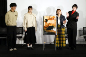 11/22(土)、映画チア部発足10周年企画として映画チア部京都支部卒業生の村田陽奈さんが監督を務めた『折にふれて』の1日限定上映を開催しました。上映後のトークも映画チア部の進行のもと開催。本作は京都芸術大学の卒業制作として作られ、主人公の引きこもりの兄・むっちゃんを演じられた豊山紗希さんもトークに登壇。映画チア部からは最初に村田監督へ「本作でこだわった部分は?」という質問が飛ぶと、「音にこだわった」と村田監督から回答が。企画当初から音にこだわって製作された経緯をご説明いただきました。またトークは画角についても話が及び、本編の中でアスペクト比が2種類あることについて編集段階で色々試した結果、今お客様に見ていただいている本編が出来上がったとのこと。現場中では「引きこもりであるむっちゃんの孤独を引き出すための現場づくりを監督がしてくれていた」と豊山さん。撮影から2年経った本作ですが映画の裏側をたくさんお聞きできたトークとなりました。上映後には、2Fロビーで村田監督、豊山さん、そして映画チア部とご鑑賞のお客様の中から希望者による交流会も実施されました。