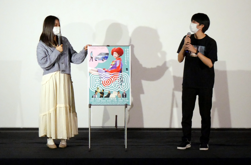 『POP!』初日の1/15(土)上映後、主演の小野莉奈さんと小村昌士監督の舞台挨拶を開催しました。小野さんがデビューされたドラマで一緒に出演していたという小村監督、ご自身の監督としての長編デビューにはぜひとも小野さんに付き合ってもらおう!と当て書きをされたそう。ちょっと変わってるところが小野さんの“素”の魅力だと感じていて、それを最大限に活かすよう「受け」の芝居をするキャラクターを作ったと話されます。脚本を読んだときはリンちゃんの考えていることがわからず戸惑ったという小野さんですが、一週間の撮影期間はとても充実した時間だったそうです。「すごく集中してる小村監督を見てスタッフもキャストもそれについていくような、団結感のある現場だった」と話されました。冒頭のオーディションシーンについてや炎天下の駐車場での撮影の過酷さ、劇中のリンちゃんの絵は実際に小野さんが描いたというエピソードなどなどたっぷりとお話しいただき、質疑応答やサイン会などでも大いに盛り上がりました。