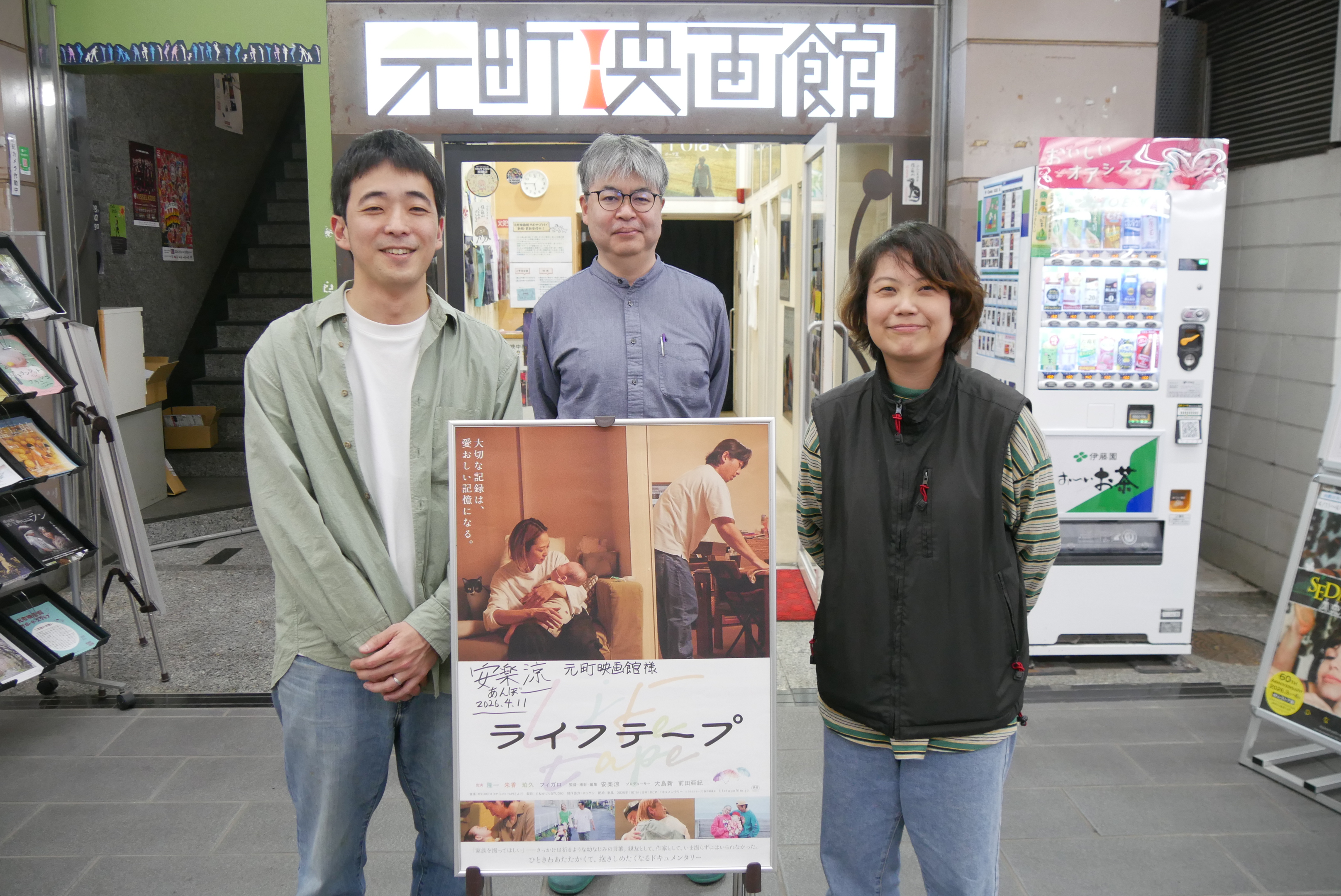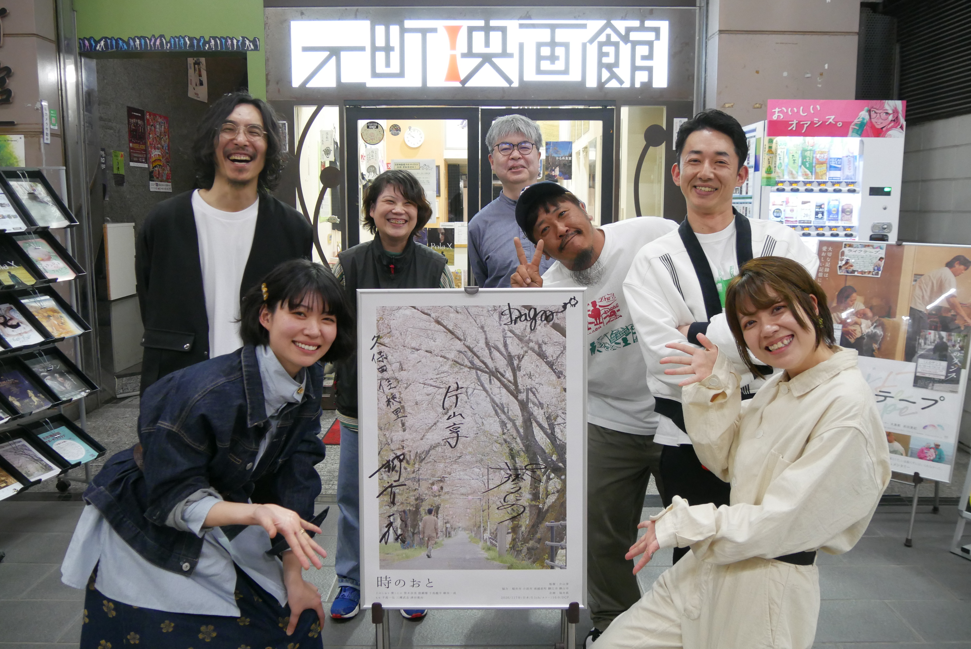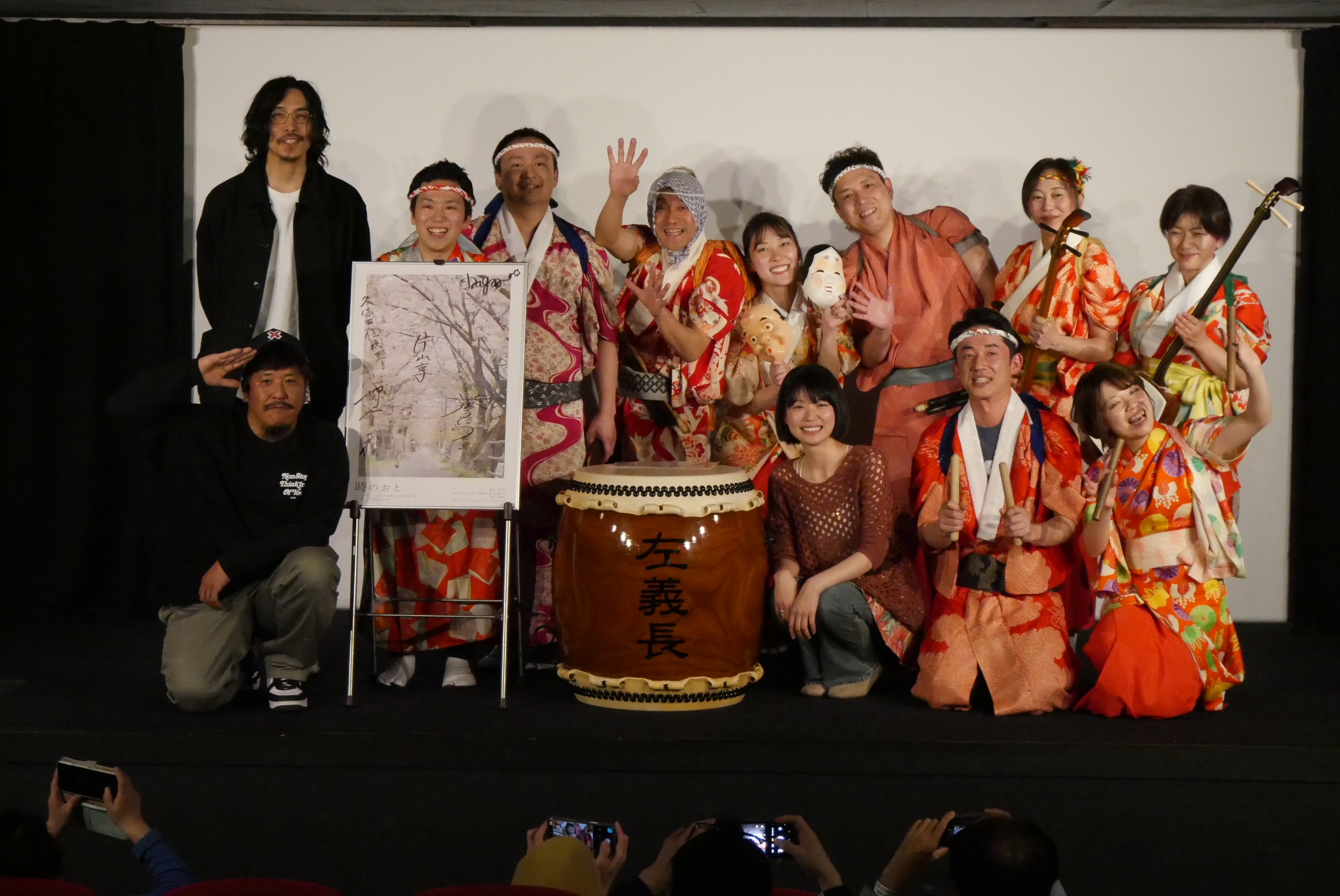 4/11(土)、12(日)『時のおと』の上映後、葵うたのさん、千馬龍平さん、柳谷一成さん、久保田佳穂里さん、片山享監督の舞台挨拶、12(日)には勝山左義長ばやしの実演を行いました。本作は福井県で撮影されており、片山享監督は福井県出身。2024年の北陸新幹線の延伸伴って、馴染みがないであろう福井の方言を近く感じてもらいたいという福井県のプロジェクトに携わっていたのが本作に出演されている津田寛治さん。津田寛治さんからの「監督をやってみない?」という電話からこの作品の企画がスタートしたそうです。方言というものを考えるうちに「方言は音、街の音に方言の音階が混ざることによってその街でしか撮れるものが撮れるのではないか」という形でこのような街の映画になったとのことです。千馬さんは福井在住の実際の漁師さんで、この日も朝の漁に出てから神戸に駆けつけてくださいました。久保田さんも福井県の勝山在住で幼い頃から勝山左義長ばやしに関わられており、少しでも祭りを知ってもらうきっかけになればということで本作に参加されたそうです。本作には俳優が6名と、総勢200人ほどの福井の地元の方々が参加、また柳谷さんは撮影前に実際に福井に1ヶ月間滞在したあとに撮影に臨まれたそうです。葵さんは埼玉県出身で、方言というものに縁遠かったこともあり撮影前は馴染めるか不安もあったそうですが、「贅沢で青春を追体験できたような時間だった」と撮影を振り返られていました。2日目の12日に実演を行った勝山左義長ばやしは「春を呼ぶ奇祭」とも呼ばれ、片山監督は本作において「最後には春を呼びたかった」という想いがあり、映画の本編でも祭りのシーンは印象的なシーンとなっています。初日から登壇してくださっていた久保田さん、勝山左義長まつり保存会の方がこの日7名駆けつけてくださり、また映画本編さながらに柳谷さんが加わり総勢9名での勝山左義長ばやしの実演となりました。勝山左義長まつりは毎年2月の最終土日の開催です。映画を観て気になった方はぜひ福井県や、勝山市に足を運んでいただければと思います。
