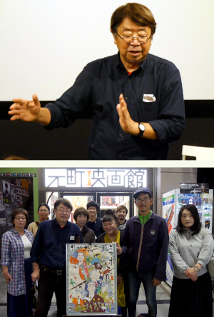 『ニッポニアニッポン フクシマ狂詩曲』初日の10/26(土)上映後、才谷遼監督をお迎えしてトークを開催しました。2011年4月、未曾有の大災害に遭遇してひと月足らずで花見の宴会で大騒ぎする日本人の姿を見て「これを映画にできないか」と思ったことが制作のきっかけだったと才谷監督。師事した岡本喜八監督が戦争をテーマに喜劇を作り上げたように、原発というものと対峙し葛藤する人間を描かれました。岡本監督の『肉弾』で寺田農さんが演じた“あいつ”が生き残っていればこんなキャラクターだろうと作った役場の助役・村井を寺田さんに演じてもらえたのが嬉しかったそうです。劇中に頻繁に登場する多彩なアニメーションについても、CGでやれば予算は1/3で済むと笑いつつ、手作りでひとコマひとコマ作られたアニメーションの持つ魅力へのこだわりもお話しいただきました。震災後に東北から関西に移住してこられたお客さまからは、「私が実際に感じたことがそのまま映画になっている!」というご感想を話していただきました。