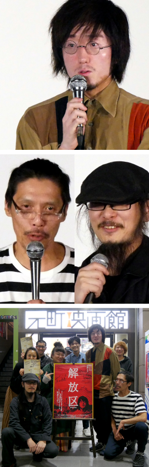 『解放区』初日の11/16(土)上映後、太田信吾監督にお越しいただき、舞台挨拶を開催しました。2010年に、大学の卒業制作であるセルフドキュメンタリーの上映があり初めて大阪・西成に足を踏み入れた太田監督。「先入観があり恐々行ったが、街のおじさんたちも観に来てどんどん声をかけてくれた。一気に街の印象が変わり、ここで映画を作りたいと思った」と話します。西成の“街そのもの”を映画に映し出すため合宿スタイルで撮影に臨み、現地の人から聞く西成の姿を日々脚本に反映して制作されました。リアリティを求めるあまり、助監督に「覚せい剤買って来て」と思わず口走ったというエピソードには場内が沸きました(もちろん買えるわけもなく映画では小道具を使っています)…。そして後半では、西成で生まれ育ち本作に出演しているDJ WAKKYさんと、撮影のための合宿所として店の2Fを開放してくれたカフェEARTHの寺川大地さんがサプライズ登壇。それぞれ映画についてや西成の街についてお話ししてくださいました。