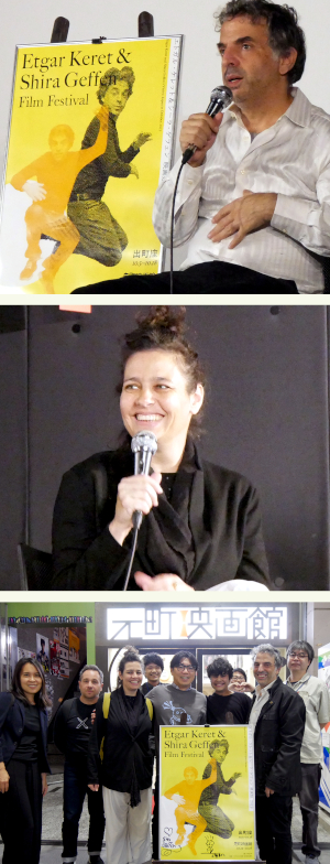 「エトガル・ケレット&シーラ・ゲフェン映画祭」開催中の10/17(木)、ドキュメンタリー『エトガル・ケレット ホントの話』上映後にエトガル・ケレットさんとシーラ・ゲフェンさんをお迎えしてトークイベントを開催しました。進行は、本企画を主催された甲南大学文学部教授の秋元孝文さん。ケレット著「あの素晴らしき七年」の訳者でもあります。ケレットさんは小説家、脚本家、映画監督、役者としても活躍されており、その創作活動は多岐に渡ります。ケレットさんいわく「自身を“ストーリーテラー”だと思っており、表出の形が違ってもやっていることに違いはない」。ゲフェンさんとの共同制作については、「一方がお皿を洗って一方がゴミを捨てるというように、日常で意識せずやっている役割分担と同じ。シーラは夢見がちで私は寓意的と、表現のタイプが異なることもうまくいく秘訣」と話されました。サイン会ではキュートなイラスト付きで「スケートボードに乗ってあなたに花を届けにいくところだよ」などおひとりおひとりに語りかけていらっしゃいました。