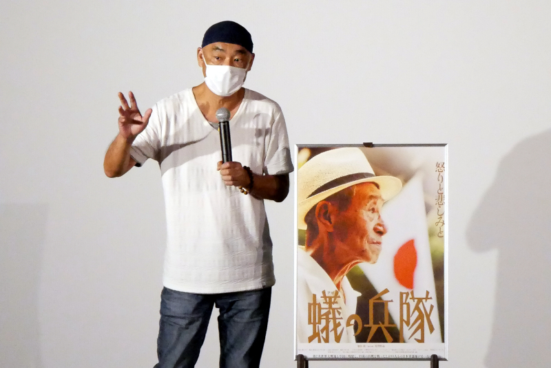 『蟻の兵隊』初日の8/14(土)上映後、池谷薫監督の舞台挨拶を開催しました。2021年は、本作の主人公である奥村和一さんが亡くなられて10年にあたります。そんな奥村さんとの撮影時のエピソードを、たっぷりとお話しいただきました。奥村さんの〈執念〉、池谷監督の〈狂気〉。池谷監督の狂気が奥村さんを追い詰めていくことに耐えられなくなったスタッフとの取っ組み合いのケンカ…。この映画そのものも凄まじいですが、その裏側はもっと凄まじく、ご本人が言う通り本当に「狂って撮った」のだと納得させられます。そして戦争の〈被害〉だけでなく〈加害〉の両面から描いた作品だからこそ、スクリーンの中の奥村さんの姿は「一生離してくれない」戦争の恐ろしさを強く、強く訴えてきます。公開から16年。まだまだたくさんの人に、何度も何度も観ていただきたい映画です。