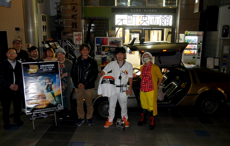 『バック・トゥ・ザ・フューチャー』が2020年に公開35周年を迎えたことを記念した”4Kニューマスター・ロードショー”。そのラスト・ラン企画として、マーティがタイムスリップした10/26(火)に、全国の映画館で『バック・トゥ・ザ・フューチャー』PART1の1日限定特別上映会を開催し、元町映画館も参加しました。そして元町映画館だけの特別企画として、〈デロリアン・オーナーズ・クラブ〉副会長の橋本達也さんに愛車をお借りし、劇場前に展示させていただきました。遠方から駆けつけてくださったファンの方や通りすがりに見つけて驚く方、老若男女いろんな方に楽しんでいただけました。小さい子どもも「かっこいいね~かっこいいね~」と喜んでくれ、映画を知らずとも、世代を超えたこの車の魅力を改めて感じました。字幕版の上映後には、橋本さんと、同じくデロリアンオーナーで公道を走れる形でタイムマシン仕様に改造したことが一時期ニュースにもなった津和敏夫さんのおふたりに、デロリアンについてたっぷりお話しいただくトークイベントを開催しました。橋本さんは海辺の高校に通っていたがために、放置車が潮風にさらされ朽ちていくのを毎日目にして「錆びない車がいい」という思いがデロリアン所有のきっかけだと話されました。「お前の希望を叶えるのは(車体がステンレス製の)デロリアンしかない」と友人に言われ、実は映画は観ていなかったが購入し、その後映画を観て大好きになったそうです。津和さんは幼い息子が映画に夢中になり、家族で車に乗っているときに偶然橋本さんの車と出会い、追いかけたのがきっかけだと話されました。そしてタイムマシンへの改造の過程を、写真を見せながらお話ししてくれました。最後には橋本さんから、「デロリアン乗りならつっこまずにはいられない映画のシーン」をいくつかお話しいただき、盛り上がりました。「デロリアンは“雨ざらしになっている40年前のテレビ”のようなもの」と橋本さんは言いますが、欠陥の多い車種なのに根強い人気があるというその抗いがたい魅力にも触れられた時間でした。