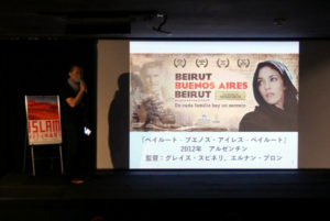 イスラーム映画祭5『ベイルート-ブエノス・アイレス-ベイルート』9/23(水)の上映後、本映画祭主宰の藤本高之さんによる作品解説を行いました。ブエノス・アイレスに暮らすレバノン移民の末裔の女性が、曾祖父の人生を追ってレバノンを旅する姿を描いたドキュメンタリーである本作。移民のムスリムを描いた映画はめずらしく、アルゼンチン大使館の方々も「こういう映画は初めて観た」と言っていたと藤本さん。数世代にわたる多数の登場人物の相関図や、曾祖父であるムハンマドの人生年表などを見せながら、レバノンの歴史も交えてわかりやすく解説をしてくださいました。レバノンは“宗教のモザイク国家”とも称されます。イスラーム映画祭で紹介されているからムスリムの国なのだろうと誤解されることもあるがそうではないことを知ってほしいとも話されました。