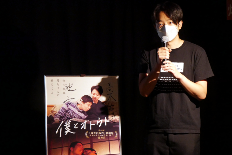 『僕とオトウト』11/2(火)の上映後、本作の音楽を手掛けられたichi_yo(中澤一陽)さんにリモートでご参加いただき、髙木佑透監督とのトークを開催しました。3歳年上のichi_yoさんとは大学でバンド活動をしていた際に共通の知人を介して知り合い、音楽の趣味もぴったりですぐに仲良くなったと髙木監督。その後ichi_yoさんは上京し、現在はスタジオミュージシャン、作曲家、編曲家として活動されています。本作では最終的にカットされましたが、弟の壮真さんとお母さんと3人でカラオケに行き、壮真さんが大好きな米津玄師さんの「パプリカ」を歌うというシーンがあったそうです。「パプリカ」の音楽は権利をクリアすることが難しく、ichi_yoさんに相談されました。「実は映画やアニメーションなどの音楽を手がけてみたいとずっと思っていたので、話を聞いて絶対にやりたいと思った」とichi_yoさん。「映画の音楽は作品とお客さまをつなぐ、“架け橋”のような存在」と話されます。作品を観ての印象、またシーンの印象から【愛】【HOME】など浮かんだキーワードをもとに曲を作っていかれました。ichi_yoさんの音楽が使用されているのは2箇所、眠る髙木監督を壮真さんが抱き寄せるポスターのシーンと、エンドロールです。込められたものに思いを馳せながら聴いていただきたいです。