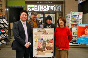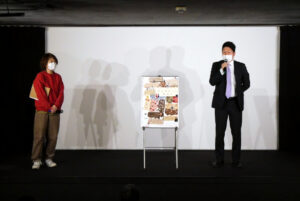 『チョコレートな人々』2/4(土)の上映後、鈴木祐司監督の舞台挨拶を開催しました。東海テレビドキュメンタリーの第14弾となる本作。普段東海テレビで報道記者として仕事をされている鈴木監督。本作に登場する夏目さんと出会ったのはもう20年も前。パン屋さんから久遠チョコレートを開業するまでも、そして現在に至るまでずっと鈴木監督は夏目さんの取材を続けていたそうです。本作の中では久遠チョコレート豊橋本店の他に神戸店が登場しますが、取材では豊橋の次に神戸に足繁く通ったという鈴木監督。舞台あいさつの後半にはお客さまからの質問や感想も募りました。お客さまから2004年のパン屋さん時代の夏目さんとパン屋さんで働く美香さん、そしてそのお母さんと夏目さんがやりとりをする映像についての質問が飛びました。鈴木監督曰く夏目さんは2004年当時の映像について、夏目さんにとってもそれは辛い経験で最近まで見ることができなかったそうです。「障害は乗り越えるものではなく、それぞれができることをやっていく。凸凹を組み合わせていく」。チョコレートと出逢い、そんな風に夏目さんの考えは変わっていったそうです。鈴木監督が20年近く、夏目さんの取材を続けているからこそ、この映画『チョコレートな人々』が完成したその先のお話も鈴木監督から聞くことができました。お客さまからもたくさん手があがり、質問、感想共に時間いっぱいまでお受けいただき、暖かい雰囲気の舞台挨拶となりました。