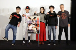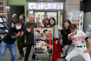 『野球どアホウ未亡人』1/5(金)の上映後、藤田健彦さん、井筒しまさん、秋斗さん、工藤潤矢さん、くれい響さん、小野峻志監督の舞台挨拶を開催しました!劇中衣装であるユニフォーム姿で登場した藤田さんです(登壇時だけでなく、本当にユニフォーム姿で劇場に現れ、イベント後は劇場を後に…)ポスタービジュアルにもある”ボールの持ち方について”の裏話も。秋斗さん、工藤さんは舞台を中心に活動されていることもあり、映像と舞台の違いや、本作の撮影現場での小野監督とのやりとりの裏話なども飛び出しました。井筒さんには劇中での森山みつきさん演じる夏子との関係性において、観客からよく出る感想について現場では意識されていたのかという話に。終始和気藹々とした舞台挨拶となりました。