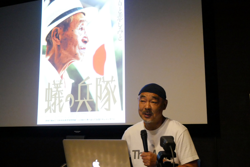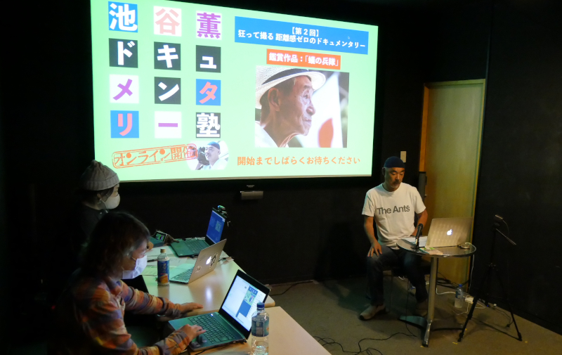 新型コロナウイルス感染拡大により、2020年は一年間休止した「池谷薫ドキュメンタリー塾」。準備を重ね、2021年からはオンラインで復活!「池谷薫ドキュメンタリー塾オンライン」第2回を5/27(木)に開催しました。今回は池谷薫監督の代表作でもある『蟻の兵隊』。第二次世界大戦終結後、中国に残留して内戦を戦った日本兵・奥村和一さんから”日本軍山西省残留兵問題”に向き合ったドキュメンタリー。イベントタイトルにもある「狂って撮る」の言葉。如何様にして池谷監督自身が被写体の奥村和一さんを撮る過程で”狂って”いったのか、熱量たっぷりの2時間超の講義でした。前回の第1回『延安の娘』ではカメラ位置や構図、音楽の使い方などドキュメンタリーを撮る上での映像技術のお話がメインでしたが、今回の『蟻の兵隊』はどちらかというと池谷監督が奥村さんとどう向き合ったか、奥村さんと”一緒に”どう『蟻の兵隊』を作り上げていったか、などといった撮影時の監督としての心の持ち方のお話が中心となりました。同じ監督でも作品、被写体が変わればこうも映画の撮り方が変わるのか、と第1回から連続で受講された方にはおわかり頂けたかと思います。次回第3回で取り上げるのは池谷監督作ではなくプロデュース作「ちづる」。こちらもぜひお楽しみに!