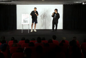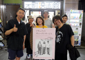 『ドキュメント サニーデイ・サービス』 7/22(土)の上映終了後、曽我部恵一さん、カンパニー松尾監督の舞台挨拶を開催しました!本作の企画はドラマーの丸山さんの追悼ライブを2本を映像に撮っていて、それをまとめた映像を曽我部さんが本作のプロデューサーに見せたところ、「ドキュメンタリー映画にしたらいいんじゃないか」と言われ映画としての企画が立ち上がったそうです。曽我部さんと松尾さんはその1年くらい前に別のアーティストのMVの仕事で出会っており、サニーデイの映画の監督を、という話が来たときは「長年サニーデイのファンだったから、率直に嬉しかった」「自分の興味のあることを仕事にしているし、自分の興味のある人を撮っている。サニーデイを撮れるのは嬉しい」と、当時の心境を語られました。「最初はライブ映画のつもりだった」という曽我部さん。松尾監督も「現在のサニーデイをまず見せたい」という思いから2021年のツアーから本編が始まる構成になったそうです。結果2時間30分近くある本編にはサニーデイの結成から現在までの歴史を辿る内容にもなっていますが「(サニーデイの)歴史を深掘りする内容になるとも考えてなかった」ともおっしゃられていました。舞台挨拶は後半から曽我部さん、松尾監督のクロストークの形にもなり、印象的な曽我部のボートのシーンにも「本当は言いたくないんだけど…」と松尾監督は言及されていました。「(コロナ禍で)ライブに来たくても来れない人もいただろうから、その人たちにも映画を届けたい」との言葉通り、サニーデイの歴史もそして今のサニーデイの魅力もたくさん詰まったドキュメンタリー映画となりました。