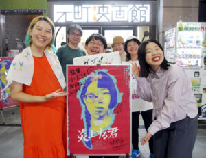 『炎上する君』8/12(土)の上映終了後、ふくだももこ監督・うらじぬのさん・国海伸彦さんの舞台挨拶を開催しました!本作はうらじぬのさんが所属するレプロエンタテインメントの「感動シネマアワード」という企画から生まれた作品。ふくだ監督が「うらじぬのさんを撮りたい!」というところからうらじさん主演の映画というのがまず決まって企画がスタートしたそうです。西加奈子さんの小説『炎上する君』が原作となったことについては「うらじさんが一番美しく、素晴らしく映る作品を自分が作っても良かったけど、元々西加奈子さんの小説が好きでいつか映像化したいとも思っていた。うらじさんがいればできるんじゃないかという確信があった」というふくだ監督。自分が『炎上する君』の梨田を演じるとなってから原作を読んだといううらじさんは「梨田のステータスが自分とそっくりで運命的なものを感じた」と原作に初めて触れられた時の印象を語られました。原作から脚本が大幅に変わっていることについては「コロナ禍を経て、自分の思っていることを全部入れよう」と思い悩みながら脚本を書かれたそうです。お笑いライブのシーンで登場するお笑い芸人役の国海さんは神戸在住の俳優で、本作にはオーディションで役が決まり、神戸と東京を行き来しながら作品に参加されていたそう。(フリップ芸も本編では一瞬だけ登場しますが、実は1ネタ分丸々国海さんが考えられたものがあるとのことで、18(金)の上映終了後に披露して頂くことが急遽決定しました!)。舞台挨拶の後半での「公開してからいろんなご意見を話し合える場を作れた映画になったんではないか。考えることが豊かな時間を作っていけるのではないか」といううらじさんの言葉通り、観た人同士がたくさん意見を交わして欲しい映画です!