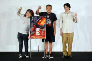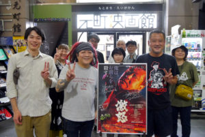 『激怒』初日の9/3(土)上映後、高橋ヨシキ監督と主演・プロデューサーの川瀬陽太さん、出演の松嵜翔平さんにお越しいただき、舞台挨拶を開催しました。ライター、デザイナーとして映画とは深い縁を持ち映画愛好家にもファンの多い橋監督ですが、学生時代には自主映画を制作されていたこともあり、ふたたび「映画を作りたい」という熱い思いがどんどん大きくなったと話されます。その思いを抑えきれなくなってまずは盟友である川瀬さんに相談したのだそうです。「刑事ものがいいんじゃない?」という川瀬さんの提案を受け、高橋監督の好みの「人がたくさん死ぬ」というところから逆方向に発想を広げていき、本作のストーリーを作っていかれました。松嵜さんについて「なんてクレイジーなやつなんだ」というのが第一印象だったと川瀬さん。いまおかしんじ監督の現場で松嵜さんが時間になっても来ず、しばらくすると血だらけの手を掲げながら現れたというのです。「アルバイト中に指先を飛ばしてしまって」と松嵜さん。「いいから帰んなさい」といまおか監督にも言われたそうです…。そんないまおか監督をはじめ、ミニシアターに通う映画ファンにはおなじみの俳優や監督たちが本作には大挙出演しています。鑑賞中も「あの人が!この人も!」と驚きますが、観終えてエンドロールを眺めていると「この人も出てたの?!え、あの人も?!」と追い切れてなかった多くの人たちに驚かされます。現場に差し入れに来て出演していった井浦新さんなどのように、それぞれが川瀬さんのもとに自然と集まった“エクスペンダブルズ”なのです。バイオレンスを描きながらも現場はとても雰囲気が良く楽しかったといい、それは3人の話される様子からも伺えました。生まれて初めて神戸に来たという高橋監督、念願叶って初めて来ていただけた川瀬さん、兵庫県在住の松嵜さん、劇場にとっても嬉しい時間でした!