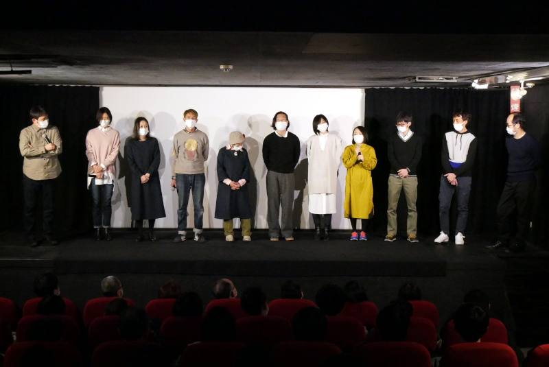 2021年の営業最終回となった12/30(木)の『ハッピーアワー』上映後、毎年恒例となった舞台挨拶を開催しました。お越しくださったのは濱口竜介監督、共同脚本とプロデューサーを務められた野原位さん、出演の菊池葉月さん、川村りらさん、柴田修平さん、福永祥子さん、申芳夫さん、出村弘美さん、久貝亜美さん、坂庄基さん、田辺泰信さん。昨年は数名ずつステージに上がる形で実施したため、こうしてずらっとお並びいただくことが久しぶりでそれだけでも胸が熱くなります。登壇はされませんでしたが、助監督の斗内秀和さん、録音の松野泉さん、プロデューサーの高田聡さんも駆けつけてくださいました。2021年は『ドライブ・マイ・カー』をはじめ、濱口監督がニュースにのぼらない時はなかったのではないかと思うほどでした。今後の作品制作のためにも、「来年は強い意志を持って“休む”」と濱口監督。キャストのみなさんも、公開から7年経ってもこうして毎年みんなで集まれることへの思いを話されました。昨年の舞台挨拶で「鳥取に移住して映画館を作る」と話された柴田さんが7月に開館された「ジグシアター」は、早くも地域のカルチャー拠点となっています。私も早く行ってみたい!客席からの質問も次々と挙がり、本作の元となったワークショップで濱口監督が感じたという、「カメラの前に人が立つことの感動」や「本読みを経てその人の声が変わっていくこと」などについてもお話しいただき、充実した時間でした。
