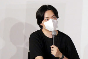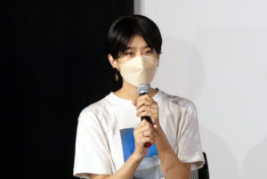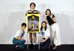『距ててて』初日の8/27(土)上映後、監督・主演の加藤紗希さん、脚本・主演の豊島晴香さん、出演の髙羽快さんと湯川紋子さんにお越しいただき、トークを開催しました。加藤さんと豊島さん、キャストのみなさんは、映画美学校のアクターズ・コースの同期生。「映画を撮りたい」と言った加藤さんのもと、一緒に面白いことができそうなメンバーが集まり、『泥濘む』という短編映画を作り2019年のPFFアワードに入選。そして同じキャスト陣/別の話で長編をという野望を実現したのが本作。撮影、録音、照明以外の仕事はキャストがみな兼任して作ったそうです。湯川さんは美味しそうなお料理を次々作る役どころですが、劇中料理も実際に担当されました。現場にあった包丁が切れ味が悪く、アジの頭を落とすシーンに苦労したと話されます。お互いにしか通じない不思議な会話を繰り広げるカップルを演じた髙羽さんは、いろんな現場で助監督などを経験されているそうです。本作の現場は「(準備が足りていなくて)いろいろあり得ない」と言いつつ、「加藤さん豊島さんが“やりたいこと”に猪突猛進している状態を邪魔しない方が面白いと感じたから、あえて手出しを控えた」と愛のある発言。素敵なチームです!「予定通りに終わらなかったりうまく進まないけど、誰もピリピリしてなかった」と湯川さん。「とにかく“楽しい”現場にすることを第一に考えていた」という豊島さんの言葉は当たり前のようでいて実現が難しいことも感じられ、胸に残りました。