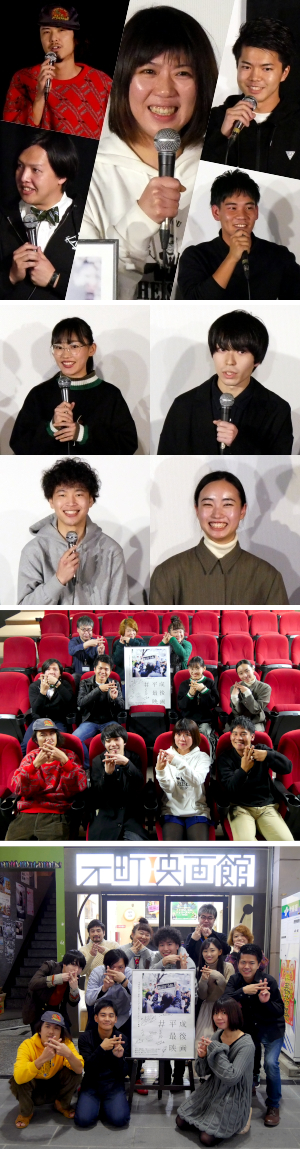 平成最後の日に映画撮ってた!って言いたい―2019年3月、加藤綾佳監督のそんなつぶやきが予想をはるかに超える反響を呼び、監督30名、役者300名から参加希望の連絡が殺到しました。そして加藤監督ら主要メンバーによる選考を経て、〈平成最後の日に撮影をする〉ことを条件にした全11名の監督によるオムニバスムービー『#平成最後映画』が誕生しました。東京でのイベント上映を経て、関西初上映となった12/28(土)・29(日)の本作上映後、舞台挨拶を開催しました。登壇者は企画発起人であり1話目の『たとえば世界の終わり』から加藤綾佳監督、出演の北林佑基さん、志波景介さん、2話目の『決まった?』から小池匠監督、4話目の『Next』から出演の工藤成珠さん、5話目の『僕のパ、あなたのパ』から出演の日下七海さん、6話目の『変遷』から山下大裕監督、8話目の『視線不外交』から宮本杜朗監督、ふたつめのエンドロールムービーからオオギシトモヒロ監督と総勢9名!それぞれ作品に込めた思いや現場でのエピソードなどをお話しいただきました。これが映画納めとなるというお客さまが多数いらっしゃったことにみなさん感慨深げでした。