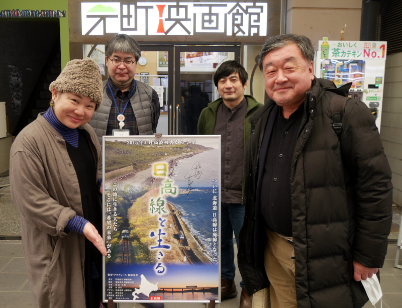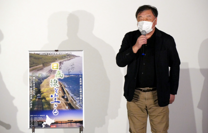 『日高線と生きる』2/5(土)上映後、稲塚秀孝監督にお越しいただき舞台挨拶を開催しました。稲塚監督は北海道・苫小牧のご出身。高校時代は日高線を利用されていたそうです。高波被害は以前からあり、いつものように復旧するだろうと思っていたらまさかの廃線が決定。急ぎ取材を進め本作を完成されました。「“バス転換”と言うけれど、言うほど簡単なことではない」と稲塚監督。数時間の移動もざらにある北海道での暮らしでは、列車とバスでは利便性がまったく違うと話されます。北海道でもこの後次々と廃線が決まっている路線があり、全国的に見てもその動きはまだまだ続きます。そんな中稲塚監督は、徳島の阿佐海岸鉄道で世界初運用となったDMV(デュアル・モード・ビークル)を見に行かれました。これは線路と道路を同じ車体で走れるもので、車輪とタイヤを約15秒で変換できるそうです。この車体の制作は北海道の会社が手掛けており、鉄路活用のキーになってほしいと期待を込められます。舞台挨拶後のサイン会では、日高線や北海道への思いやゆかりなどを話される方も多く、にぎわいました。