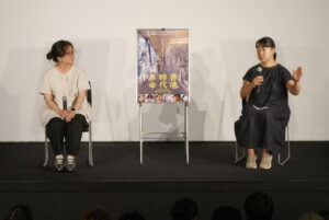 9/14(日)『香港時代革命』の上映後、平野愛さん(プロデューサー、編集)、阿古智子さん(社会学者・現代中国研究)のトークイベントを開催しました。2019年12月に1週間ほど香港に滞在していたという阿古さん。まず阿古さんから「日本人が撮った映画であるということ、中の人に寄り添いながら、でも第三者的な視野も持って、いろんな側面から何が起こっているのか、なかなか聞こえてこない声を掬い上げようとするような映画だった」と本作についての感想を述べられました。平野さんと佐藤監督がどういう想いで現地に入って撮影を行っていたか、映画で描かれた以降の香港の現状など遅い時間ながらボリュームのあるトークイベントとなりました。