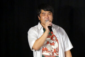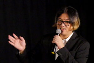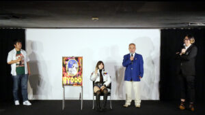 『HYODO 八潮秘宝館ラブドール戦記』初日9/17(土)の上映後、福田光睦監督、主人公である兵頭喜貴さん、そして美しいラブドールさんにもお越しいただき、舞台挨拶を開催しました。ビートメイカー、DJ、アルジェント研究会関西支部長など多方面に活動をされるL.A.H.さんが司会を務められました。一見ムダなように思える場面をカットせずに多用している独特の間とリズムについてL.A.H.さんが尋ねると、「編集の仕方で見せ方を変えることができるのが映像。もっと変態的だったりカルト的だったりトンガってる部分だけを抽出するという選択肢もあったけど、兵頭さんの魅力はそこじゃないと思った」と福田監督。ちょっと間の抜けたところや無意味に感じられる時間に面白さを感じ、それを大事に構成したと話されます。兵頭さんは、福田監督いわく「自分大好きな人」。兵頭さんご自身も、「自分が大好きなものを自慢したいという気持ち」と話され、そこに恥ずかしさやためらいを持たないところが人を魅きつけるように感じます。とにかく嬉しそうに話される姿を見ていて楽しいのです。今回お連れいただいたドールさんは頭部とボディは元々別の持ち主だったそう。ドールの素材についてやあまりに安いものは健康被害に及ぶ危険があるなど、ためになる(?)知識もお話しくださいました。