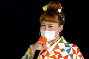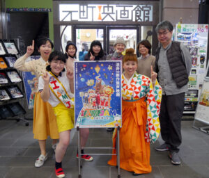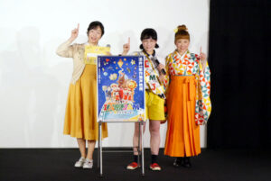 俳優として活躍する辻凪子さんが監督・主演し、新作として完成させた“サイレント(無声)映画”『I AM JAM ピザの惑星危機一髪!』。公開初日の12/17(土)と18(日)は活弁公演を開催しました。活動弁士は大森くみこさん、生ピアノ演奏は天宮遥さん。そしてステージ脇に潜んでいた辻さんが劇中の映像に合わせて登場するというサプライズ演出もあり、劇場内を大いに沸かせました。上映後は辻さん、大森さん、天宮さんによるトークも開催。辻さんは学生時代に観た大森さんの活弁に鳥肌が立つほど感動し、本作で念願叶って一緒に映画を制作されたそうです。サイレント期にはなかったCGを使うことはしたくないと、惑星間を飛び回るファンタジー映画ながら手作りでの表現にこだわり、「スタッフには無理を言って、やりたいことを全部やらせてもらった」と辻さん。本作の美術さんが作られたというピザとタバスコ(TABATABA)のかんざしを髪に挿した大森さんは、「活弁をつける作品の監督が“生きている”ことがこんなにプレッシャーになるとは!」と笑わせます。音楽を手掛けられた天宮さんは、「様々な音楽に彩られている映画で、しかも辻さんが細かいところまでとても音楽を大事にしてくれた」と話されました。自分のやりたいことを突き詰めつつも、「観る人を楽しませたい」を一番に考えて作られた本作。たくさん笑えて愛にあふれたジャムたちの冒険をぜひ体験してほしいです。