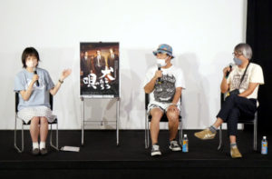 『犬ころたちの唄』8/7(日)の上映後、前田多美監督、ロック漫筆家の安田謙一さん、画家・DJのキングジョーさんにお越しいただき、トークを開催しました。主演の深夜兄弟の3人がブラックスーツ(喪服)を着て立っている本作ポスターが『レザボア・ドッグス』のようだと安田さん。すると前田監督は「『レザボア・ドッグス』みたいな映画を作ろうと思って、撮影に入る前にこの写真を撮ったんです!」と話します。兄弟それぞれの短編を撮って出ししながら長編の準備を進めるという方法で作られた本作、「気付いたら脚本フォルダに60ファイルあった」そうで、改稿に改稿を重ねるうちになぜだかどんどん“和”の風味が強くなってきたと前田監督。でも「高野豆腐の後味のような映画を作りたかった」とも言われていたので、やりたいことを突き詰めた結果なのでしょう。また、前田監督ご自身が葉月を演じたことについて、「前田監督自身が“ここにいたい”と思える場所を自ら作っているように感じる」と安田さん。前田監督は「バレてる!初めて指摘されました」と驚きの表情を浮かべます。自らの望む世界を作品として表現されているということなのかもしれません。次回作は?と尋ねられた前田監督の答えは「次はハムカツの後味のような映画にしたい」。「期待しにくいわ!」と安田さんがツッコミます。キングジョーさんがアートワークを手掛けられたJackyさんのアルバム「大人になってしまった」には、なんと「KING JOE」というジョーさんのことを唄った歌も収録されています。CDの盤面もジョーさんの絵でめちゃくちゃ素敵なのでぜひ!