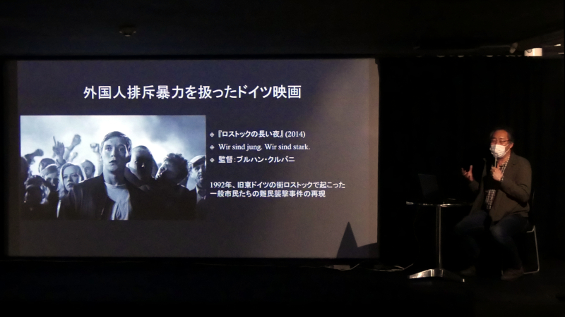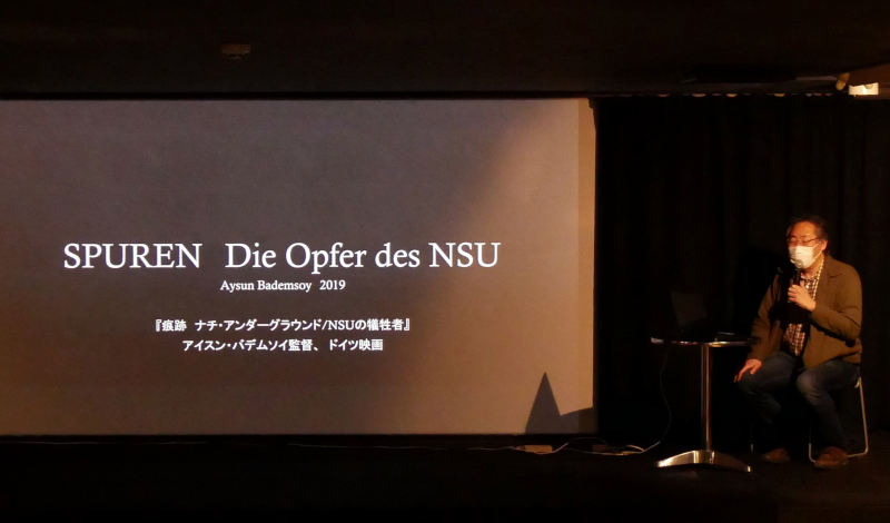 イスラーム映画祭6『痕跡 NSU ナチ・アンダーグラウンドの犠牲者』5/4(火)の上映後、ドイツ映画研究者の渋谷哲也さんにお越しいただき、「映画『痕跡』の新しさ ―移民社会を生きる普通の人々」と題してトークを開催しました。研究で2019年に一年間ベルリンに滞在されていた渋谷さん。元町映画館のような小さな映画館が街なかにはたくさんあり、本作もベルリン市内のそういった映画館4~5館で上映されていたそうです。ベルリンで本作を観て、「これはイスラーム映画祭にぴったりではないか」と、渋谷さんから本映画祭主宰の藤本高之さんに作品を紹介されて上映が実現しました。本作は、ナチを名乗るテロリストグループ【NSU】に襲撃され何人ものトルコ系移民が命を落とした事件を題材に、ドイツ(広くヨーロッパ、でも)社会に生きるムスリムが受けるヘイトクライムについて訴えます。この事件がメディアなどドイツ社会で取り上げられる場合、「なぜ彼らはこのような凶行に及んだのか」という視点ばかりで、被害者がどのような人物でどのような暮らしをしていたかということは取り残されていました。そのことに疑問を感じた、自身もトルコ移民であるアイスン・バデムソイ監督は、単に真実を明らかにするというものではなく、「被害者の声に耳を傾ける」ことを徹底した作品をつくりました。移民という出自や女性であることにかなり自覚的で意識的にそれらをテーマに据えた作品をつくり続けている監督です。本作のナレーションも監督自身が務めており、ベルリンで監督に会ったという渋谷さんは、「映画の印象そのままの、静かで理知的な方。本作では死者を悼む行為をちゃんと見せる、ある意味“映画的スペクタクル”とは真逆の作風」と話されました。