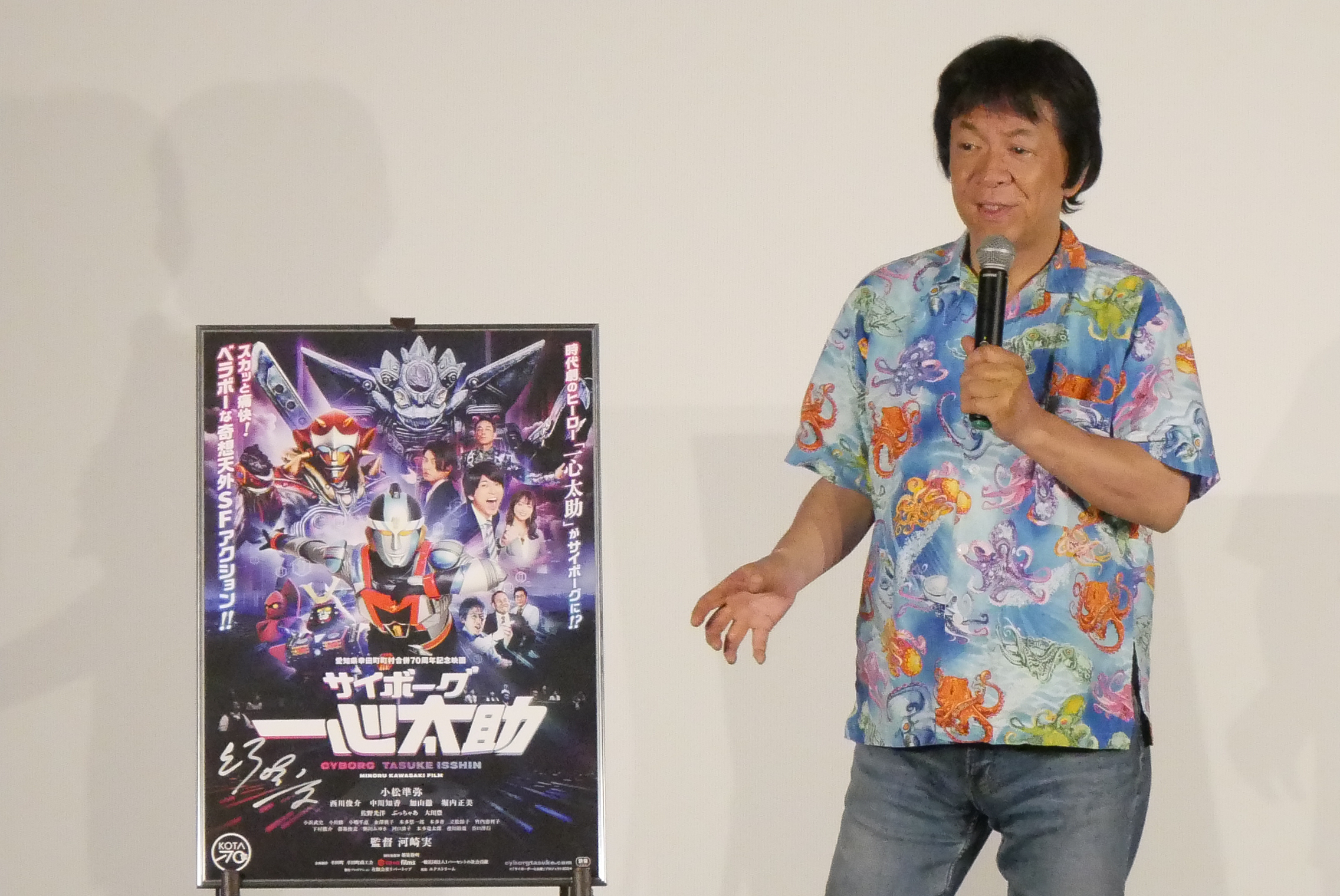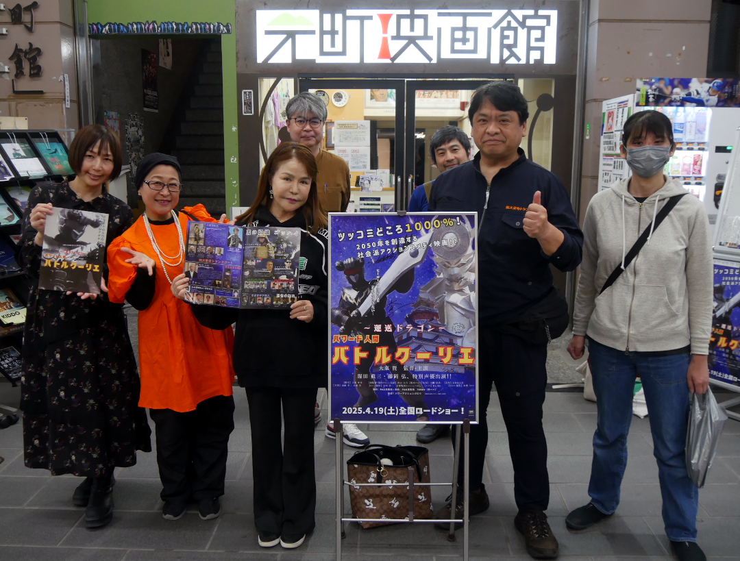 『サイボーグ一心太助』4/12(土)の上映後、河崎実監督と堀内正美さんの舞台挨拶を開催しました。『超伝合体ゴッドヒコザ』『突撃!隣のUFO』に次ぐ愛知県幸田町を舞台にした映画の第三弾である本作。登壇された堀内さんはこの日劇場で初めて本作を見られたそうで開口一番に「疲れる映画だね」とお客様の笑いを誘いました。お二人の出会いは実相寺昭雄監督が亡くなられた時、堀内さんが「俳優を辞める」と言ったら河崎監督なら「それなら最後に僕の映画に出てほしい」と声をかけられ(現場に行ったら衣装として金色の全身タイツを渡され)、そこからこの『サイボーグ一心太助』が8本目の河崎作品への出演だそう。それでもいつも「自分のセリフだけど、言ってる意味がわからない」と思いながら堀内さんは脚本のセリフを覚えているという話もありつつ、撮影の裏話やエピソードなど河崎監督と堀内さんの信頼関係も伺える、終始爆笑の掛け合いが繰り広げられました