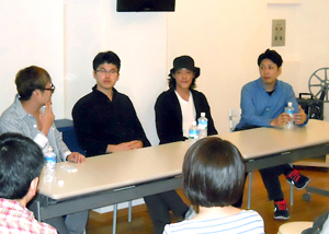 若手監督に未来はあるのか?という田辺さんからの質問に対して、石原プロデューサーは「その人次第」、内田監督は「個人の問題」、下手監督は「自分の中では、未 来は100%ある。今あることを淡々とやっていく」とのお答え。内田監督と石原プロデューサーは、「座談会の前日、大阪でチラシ配りをしたけれど、映画というキーワードにひっかからず、も らってくれる人が少ない」と興行に結びつける難しさもお話しされました。