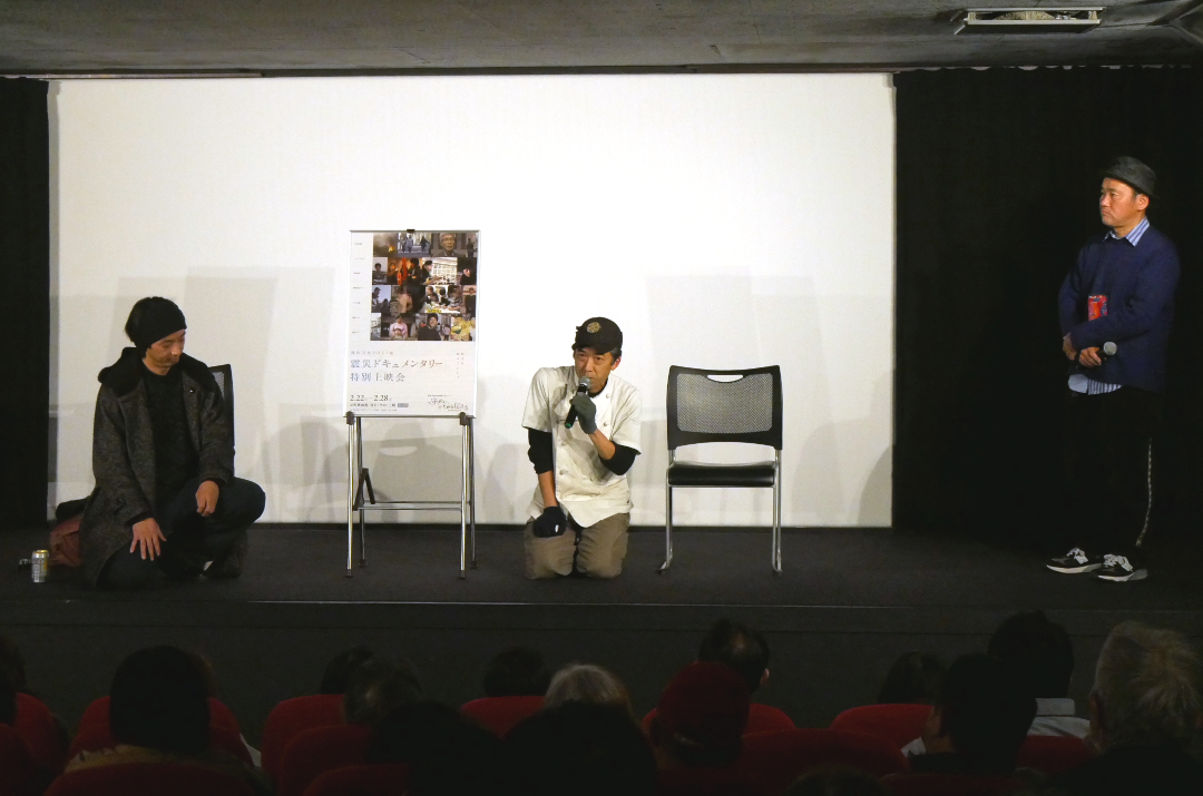 『関西 民放NHK7局 震災ドキュメンタリー特別上映会』「未来は今 ~10 years old,14 years after~」2/25(火)の上映後、森山未來さん(俳優・ダンサー)、井上剛ディレクターの舞台挨拶を開催しました。ドキュメンタリーとドラマが交錯するいわゆる「フェイクドキュメンタリー」とも言える本作。森山さんは「フェイクドキュメンタリーは今でこそ受け入れられているが、放送当時は批判も聞こえた」と2009年の放送当時を振り返られました。井上ディレクター曰く「最初はフィクションを撮るつもりだが、いろんな事情で頓挫し。森山さんのスケジュールが3日間だけ空いてるとなり、”ドキュメンタリーのようなもの”を撮ろう」といった風に本作の企画が立ち上がっていったと話されていました。その後テレビドラマとして製作され劇場公開もされた『その街の子ども』の原点ともなった本作。撮影当時のことを思い出しながら話すお二人の姿が印象的な舞台挨拶でした。舞台挨拶の終盤では、本作にも登場する西元町のやさい食堂堀江座の店主の堀江さん(通称”せいちゃん”)も登壇し、和気藹々とした雰囲気にもなりました。