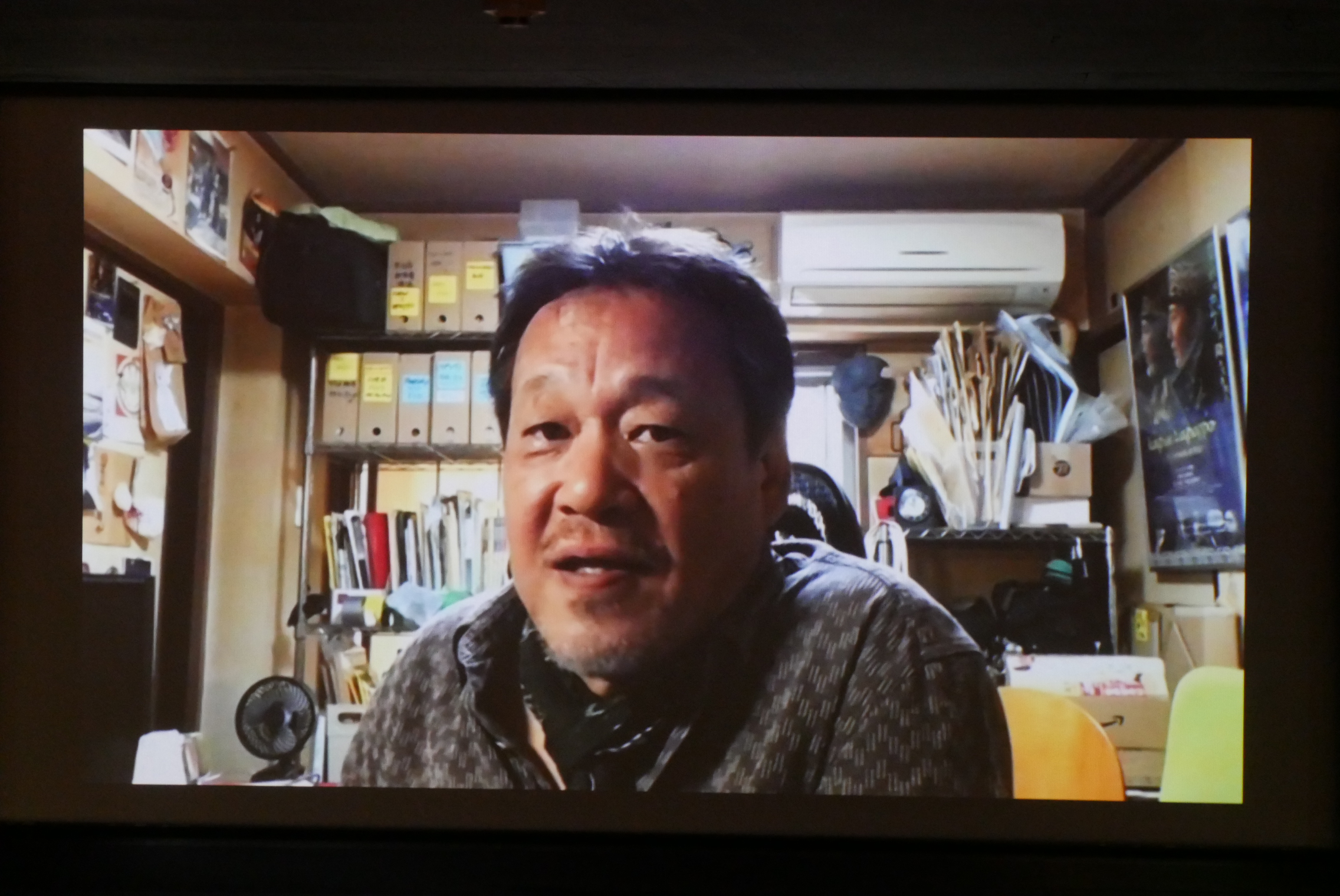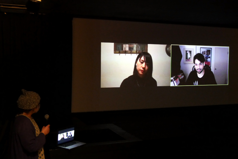 『コントラ』初日の10/2(土)上映後、アンシュル・チョウハン監督とZoomで繋いでリモート舞台挨拶を開催しました。「こんな状況でなければ神戸に行ってみなさんと直接お会いしたかった」とアンシュル監督。プロデューサーの茂木美那さんに通訳をしていただき、いろんなお話を伺いました。なんと言っても強い印象を残すのはソラを演じた円井わんさん、後ろ向きに歩く謎の男を演じた間瀬英正さんのおふたり。おふたりとも、本作の前に企画していて制作に至ることができなかった作品のオーディションで出会ったそうです。円井さんは初主演作ということで最初は固い印象があったのが、監督の目指しているものをしっかりと共有するために話し合いを大事にしていくことでソラに集中してもらうことができたと話されました。間瀬さんはキャスティングしようか迷っていたところ、絵を描けることを知って「絶対彼にやってほしい」と思われたそうです。その絵は劇中で印象的に使われています。普段の間瀬さんを見ると本作の謎の男と同一人物とは思えないほど印象が異なります。役のために10kg減量し、自在に後ろ向きに歩くためのトレーニングをして、極寒の中の撮影で「かなり過酷だったと思う」とアンシュル監督。戦争を題材にすることで最初からモノクロ映像でしか考えていなかったなど、映像へのこだわりもお話しいただきました。