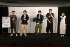 『思い立っても凶日』5/24(土)の上映後、野本梢監督、田村魁成さん、吉川流光さん、榎本桜さん、藤公太さんの舞台挨拶を開催しました。主演、そして企画プロデュースとして本作を作るきっかけにいたのが田村魁成さん。「役者として自主制作の映画を中心に活動する中で、映画をイチから作ってみたいと思っていた中で野本梢監督と出会ってお願いしました」と田村さん。野本監督は「明るい気持ちで映画館を出れるような映画を、という田村さんからの話だったが、今までの自分の作品は暗い気持ちで終わるような映画が多かったので、(依頼に対して)誰かと間違えてないかなと思った」と笑いまじりにお話しされつつも「明るい気持ちで終われる映画というのは撮ったことがなかったので、田村さんが主演ということで新たなことに挑戦できるという気持ちもあった」と野本監督。一番初めの公開から約1年経ち、榎本さんから「この映画に対する感想を改めて聞いてみたい」という言葉から登壇者の皆さんが改めて映画の感想を述べていく流れに。吉川さんは俳優でありながら芸能プロダクションの社長もされているという自身の境遇から村上由規のさん演じる横山さんのセリフが刺さったそうです。藤さんは単刀直入に「好きです!」と述べられてから、「主人公がいろんな後悔と向き合って、最終的にちょっと青春して一歩踏み出していく、踏み出し方が寄り添ってくれる感じもして好きです」と感想を述べられていました。榎本さんからは「何が成功なのかと思うことが最近あって、そういえばそういうことも描いている作品だったなと思った」との言葉もありました。舞台挨拶は本作らしく終始大所帯で和気藹々とした舞台挨拶となりました。