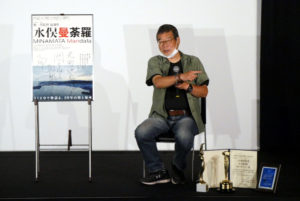 『水俣曼荼羅』初日の6/25(土)上映後、原一男監督の舞台挨拶を開催しました。原監督とともに作品づくりをしているプロデューサーで配給も務める島野千尋さんも同行され、一緒にお話しいただきました。「いつもお手本にしたいと思う作品や監督がある」と原監督。本作で目指したのは小津安二郎監督作品だという意外な答えに客席が沸きます。師事された今村昌平監督や浦山桐郎監督らの言葉を引用しながら、“庶民の哀感”をドキュメンタリーで描こうとしたのが『水俣曼荼羅』であると話されました。そして島野さんがステージにキネマ旬報文化映画ベスト・テン第1位、毎日映画コンクールドキュメンタリー映画賞のトロフィーを並べ、「これはみなさんのおかげで獲れた賞なので、ぜひ触ってほしい」と客席に回していかれました。映画賞のトロフィーを手にするという滅多にない体験に、お客さまも大興奮!現在進行している企画の話やその撮影の裏話もお聞きでき、今後の作品も楽しみです。サイン会でも、多くのお客さまと交流されました。
