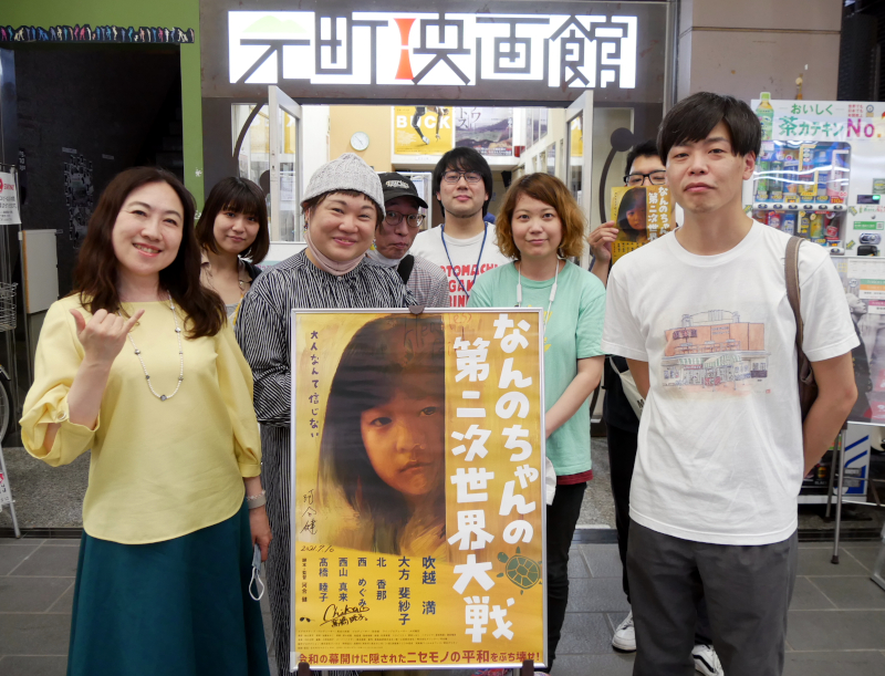 『なんのちゃんの第二次世界大戦』初日の7/10(土)上映後、河合健監督と出演の髙橋睦子さんの舞台挨拶を開催しました。本作制作のきっかけは、学生時代に若松孝二監督の『11・25自決の日 三島由紀夫と若者たち』の助監督についたことだと河合監督。背景となる戦後史を調べれば調べるほど、証言者による食い違いや資料による史実の違いに直面することとなり、あれほど大きな出来事なのに何が正しいかがわからない、そんなことあるのかと思ったことで戦争に興味を持ったのだと話されます。オール淡路島ロケで制作され、キャストの8割は島民が務めた本作。髙橋さんは映画の説明会に参加した流れでオーディションにも参加し、ご出演が決まりました。実は洲本市の市議でいらっしゃる髙橋さん。劇中ではそんな人にこんな役をやらせていいの?!と思わず笑っちゃうシーンも。まさか地元で大々的に公開され、さらに全国公開されるなんて思いもしなかったという髙橋さん、議員さんや地元の方の反応についてもお話しいただきました。