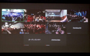 夏休み期間中の子どもたちを対象に、地域と映画館のつながりを深める上映企画「夏休みの映画館」。7月と8月に2回ずつ開催する今年のプログラムの初日7/27(土)の『ロシュフォールの恋人たち』上映前に、全国9会場のうち、横浜シネマ・ジャック&ベティ、鹿児島ガーデンズシネマ、熊本Denkikan、大阪シネ・ヌーヴォ、松本CINEMAセレクト、シネマテークたかさき、そして元町映画館の7会場をつないでのリレートークを行いました。どんな場所にある映画館なのか、また今回はどんなプログラムやワークショップがあるのか、はたまた活動弁士や演奏家などのゲストパフォーマーの紹介や、この日のプログラムに参加したお客さまの感想などの声を届けました。