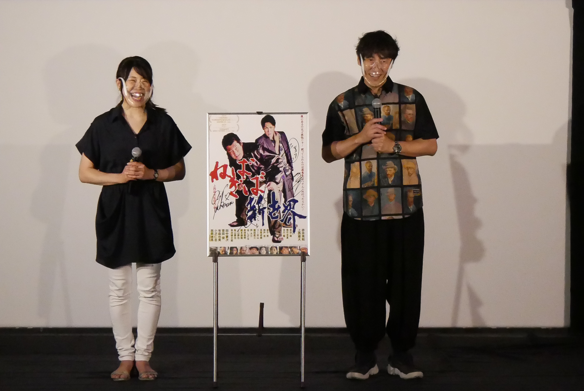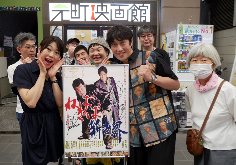 『ねばぎば新世界』8/10(火)上映後、上西雄大監督と徳竹未夏さんにお越しいただき、舞台挨拶を開催しました。この日は上西さんの前作『ひとくず』を観たというお客さまも多く、上西さんが演じたカネマサ(『ひとくず』)とコオロギ(『ねばぎば~』)の落差に驚いたという声も聞かれました。新世界を舞台に赤井英和さんと上西さんで映画を撮らないかという話が持ちかけられたとき、大好きだった昭和のプログラムピクチャー『悪名』のような映画にしたいと思い本作の企画を進めていったと上西さん。普段は撮影で使わせてもらえない新世界の商店街で、「赤井さんなら」と日中に乱闘シーンを撮影させてくれたり、街も協力してくれたと話されます。その乱闘シーンでは上西さんが熱中症で倒れたりというエピソードも(その写真がパンフに掲載されているそうです)。そして早くも続編の構想があるという発表も!期待を込めて客席からは大きな拍手が送られました。