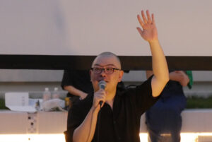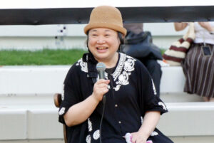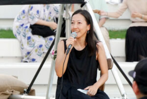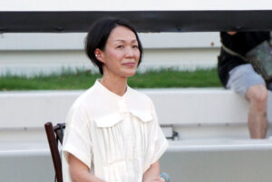 同じく19時から、鳥飼りょうさんによる伴奏のサイレント映画上映を前に、芝生のガーデンステージでは大スクリーンが設置され、スクリーン前で1時間ほど映画と神戸トークを行いました。登壇いただいたのはオムニバスの一編『すずめの涙』の野原位監督と出演・共同脚本の川村りらさん。おふたりには、『ハッピーアワー』撮影時の思い出話や、コロナ下で作った『すずめの涙』のこと、そしてミニシアターで映画を鑑賞する体験について語っていただきました。そして元町映画館からは昨年まで支配人を務めた高橋未来が登壇。ミニシアターの特徴や元町映画館の成り立ち、そして現在開催中の周年特集(ジャズ特集)なども紹介していただきました。