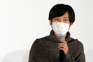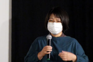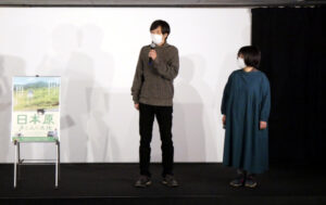 『日本原 牛と人の大地』初日の1/7(土)上映後、黒部俊介監督とプロデューサーを務められた黒部麻子さんにお越しいただき舞台挨拶を開催しました。おふたりは住んでいらっしゃる岡山県倉敷市から車で来てくださいました。企画を立てて作られた映画ではないそうで、黒部監督は屠場で働いていた2018年に本作の主人公であるヒデさん(内藤秀之さん)のことを知り、牛のことを勉強するつもりで通い始めたと話されます。通ううちに仲良くなり、カメラを持参して通い内藤さんたちの暮らしを撮り始めました。新型コロナウイルスが蔓延するまで1年ちょっとの間に撮りためた素材を繋ぎ、DVDにして内藤さん一家に渡したり、映画仲間と観賞会でもしようと考えていた黒部監督。ところがパートナーである麻子さんが「これはとても良い作品になるのではないか、“映画”としてちゃんと形にすべきなのでは」と、東京で出版の仕事に就かれていた時に交流のあった配給会社「東風」に相談を持ちかけ、もらったアドバイスを元に再編集して、東風の配給により全国での劇場公開となりました。今でも一家との交流は続いており、目まぐるしく変わる時代のスピードに戸惑いながらも自分にできることを考え、手放すべきではない感覚をしっかり持っていきたいと締められました。