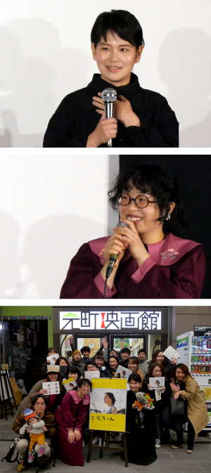 12/28(土)『お嬢ちゃん』上映後、主人公・みのりの親友“りえこ”を演じた土手理恵子さんと、みのりとともにカフェで働く“もえ”を演じた植田萌さんにお越しいただき、舞台挨拶を開催しました。本作は鎌倉で8日間で撮影が行われましたが、強風続きで大変だったそうです。みのりとりえこがバドミントンに興じるシーンについて、「下手くそやなあと思わてれるかもですが、あれが最高の出来なんです!」と土手さん。また、みのりともえがカフェ終業後にテラスで名前の由来について話すシーンでは、「このシーンで話しているのは本当の私の名前の由来。話を聞いて二ノ宮監督が脚本に入れてくれました」と植田さん。それぞれどのようなシーンかは、ぜひ劇場でご覧ください。おふたりともまだ年若い女優さんで、今後の活躍が楽しみです。土手さんは神戸のご出身ということもあり、劇場には地元のご友人たちも駆けつけにぎやかになりました。