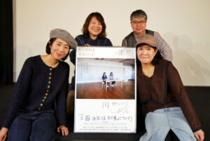 『王国(あるいはその家について)』2/11(日)の上映後に草野なつか監督、澁谷麻美さんの舞台挨拶を開催しました。愛知芸術文化センター・愛知県美術館の助成を受けて制作された本作。この助成金にはテーマが「身体」であることがあらかじめ決まっており、長編第一作にあたる『螺旋銀河』で「役者の”身体”と向き合いきれなかった」という後悔から「役者の身体」がテーマになったそうです。役者自身が役柄に変わる瞬間を見届けたいという思いからリハーサルのシーンが繰り返される映画。たくさんのシーンがあるシナリオからスタッフみんなで「物語が動くシーン」「セリフのやりとりがあるシーン」「感情が動くシーン」を抽出して何度も繰り返したリハーサルが本編にはおさめられています。出演する澁谷さんにとっては、最初に完成したこの映画を見た時に「リハーサルと本番が決定的に違う」ということを見せつけられることはある種ショックでもあったそう。撮影から7年間公開されないことに内心ホッとしてる部分もあった中、今回の本公開でたくさんの人がこの作品を観て受け止めてくれていて、「少し心が軽くなった」とおっしゃられていました。シナリオブックの購買率も高く、遅い時間でしたが舞台挨拶後のサイン会でもお客様それぞれが思い思いの感想や質問をお二人に投げかけていたのが印象的でした。