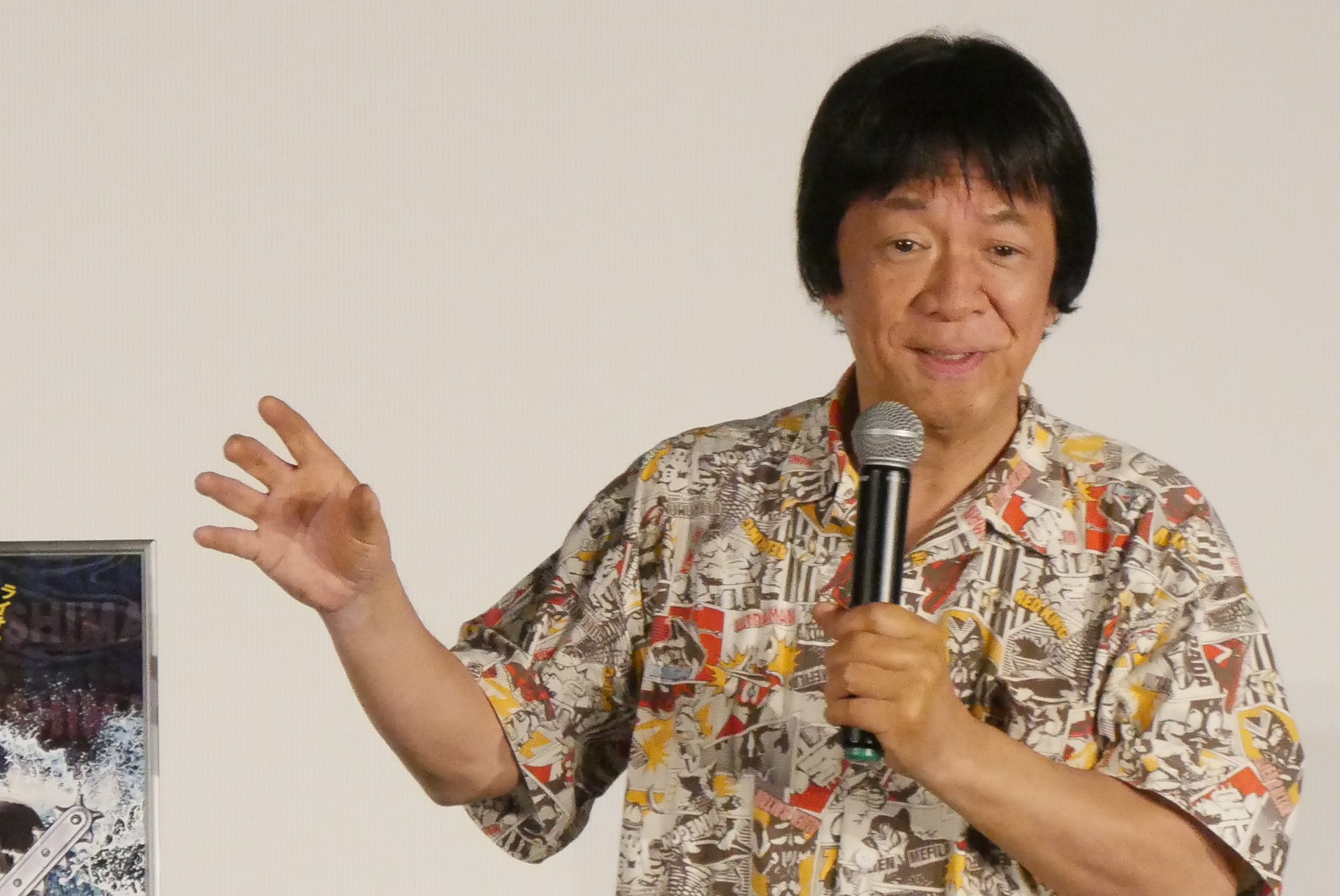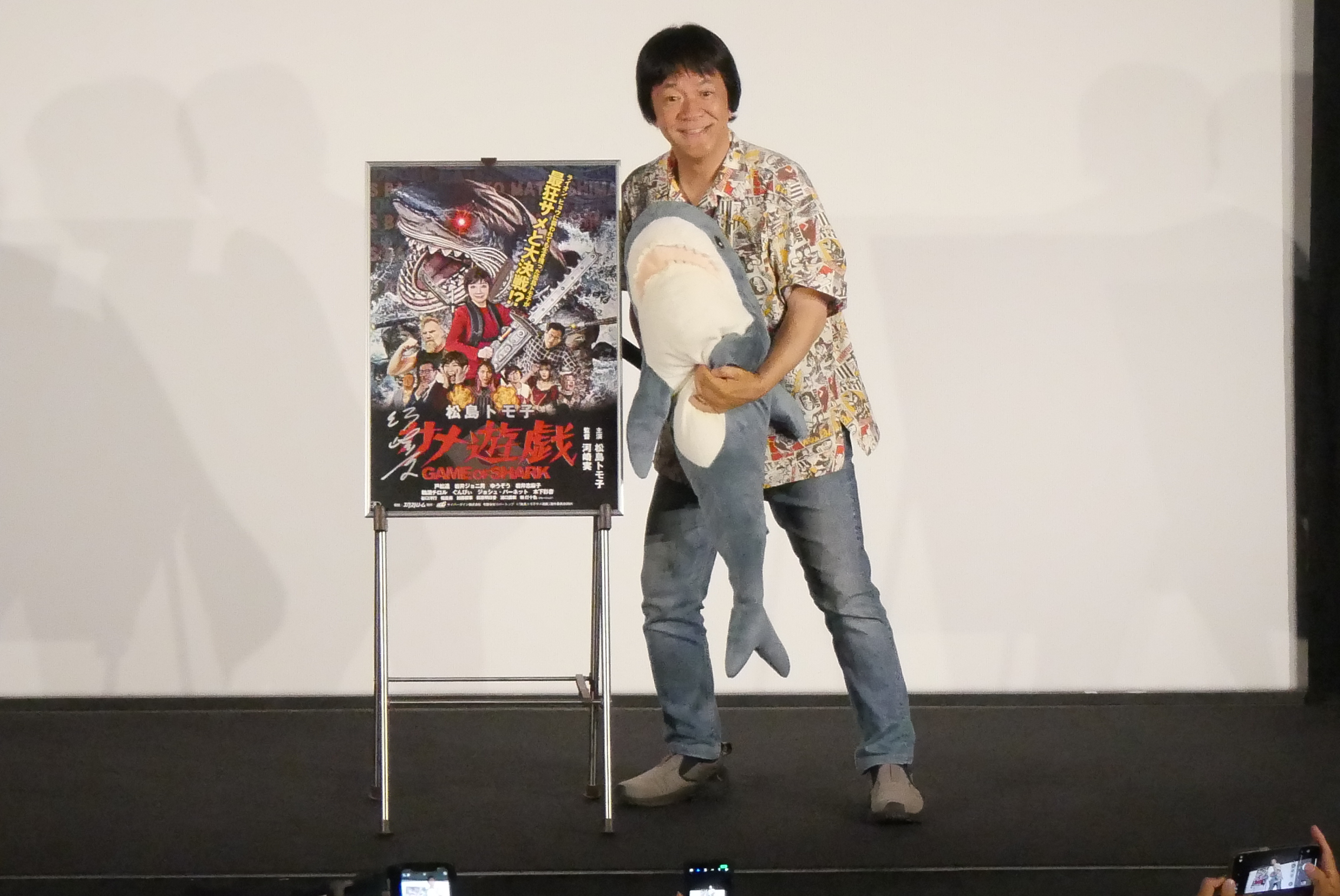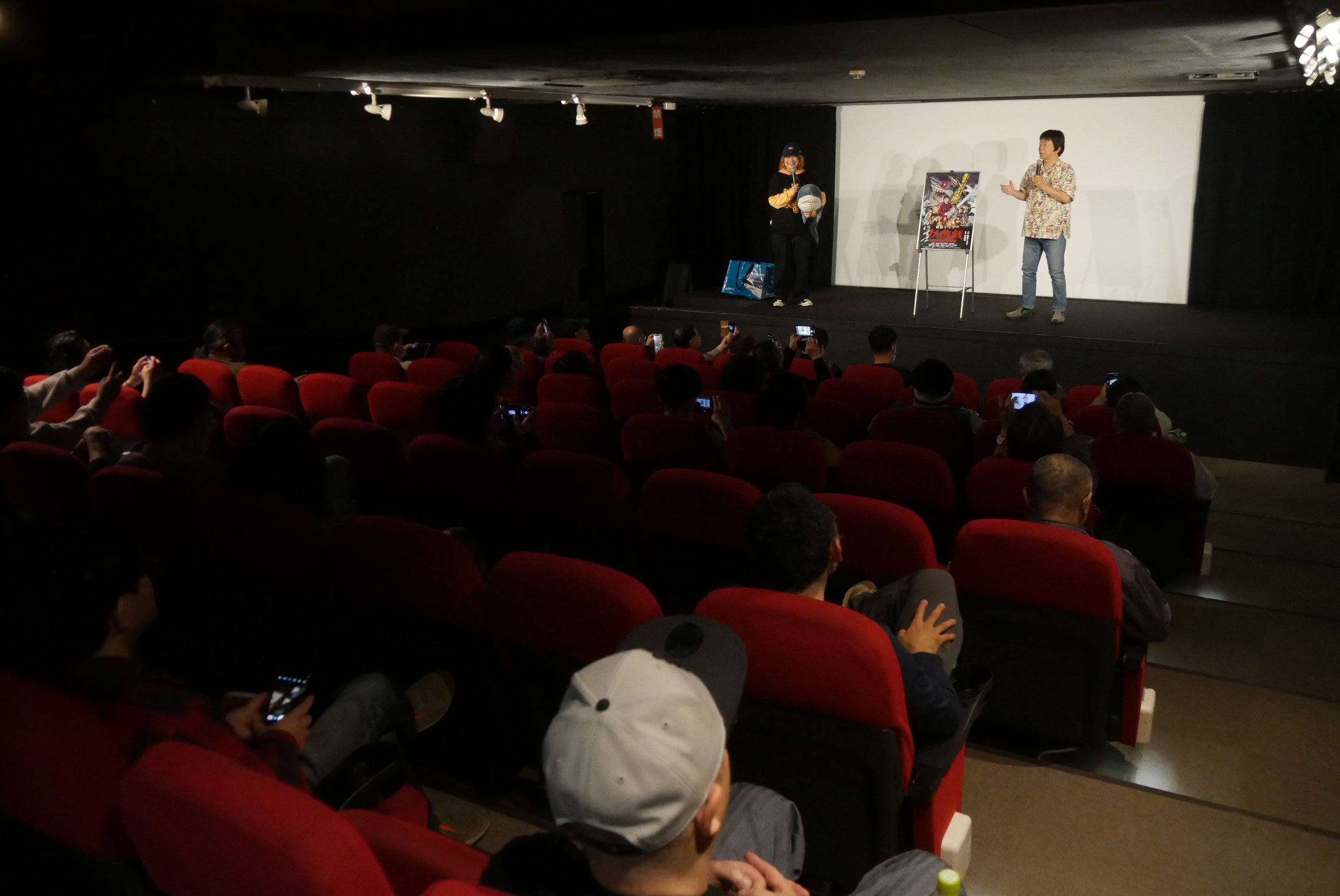 4/12(土)『松島トモ子 サメ遊戯』河崎実監督の舞台挨拶を開催しました!2019年製作の『メグ・ライオン』の企画の時に「ライオンといえば松島トモ子さん」と思っていたという河崎監督。その時は出演は叶わなかったそう(この日『メグ・ライオン』の主演の長谷摩美さんが客席に!)。松島さんにオファーした時は「嫌がってないが、無表情だった」という河崎監督談。劇中で飛び出す(サメ映画ファンの皆さんにはお馴染みの)戸松遥さんが繰り出すミスティック・シールド(『ウィジャ・シャーク2』というサメ映画の中で出てきます)ですが、本物のミスティック・シールドの合成素材をアメリカから取り寄せているという裏話も。映画に大事なのは「尺をいかに持たせるか」という河崎監督。4日間というタイトな撮影の中、ぐんぴぃさんの撮影に1日を費やしているとのこと。今回『野球どアホウ未亡人』(元町映画館では2024年元日から上映しました!)の小野峻志監督が脚本として参加されています。小野さんが高校生の時から河崎監督にSNSでDMを送ってきたりしていた縁で助監督を経て今回脚本として参加されたそう。河崎監督曰く「バカの血が脈々と受け継がれている」。例のプールのシーンの裏話、劇中で出てくる「おんな鮫追節」の裏話、などここには書ききれないくらいの爆笑エピソードが飛び出す舞台挨拶でした