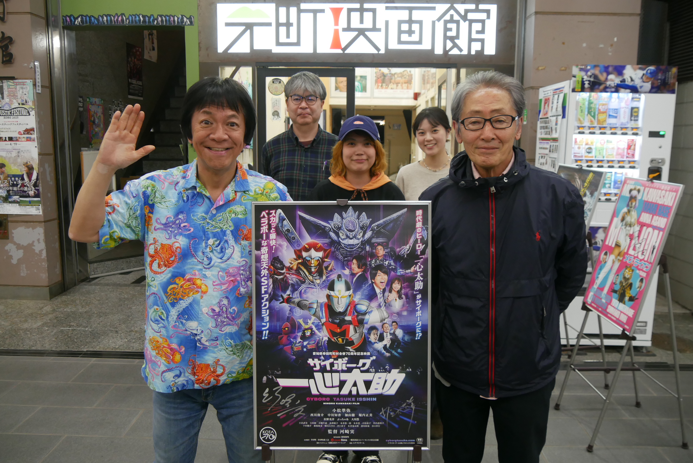4/12(土)『松島トモ子 サメ遊戯』河崎実監督の舞台挨拶を開催しました!2019年製作の『メグ・ライオン』の企画の時に「ライオンといえば松島トモ子さん」と思っていたという河崎監督。その時は出演は叶わなかったそう(この日『メグ・ライオン』の主演の長谷摩美さんが客席に!)。松島さんにオファーした時は「嫌がってないが、無表情だった」という河崎監督談。劇中で飛び出す(サメ映画ファンの皆さんにはお馴染みの)戸松遥さんが繰り出すミスティック・シールド(『ウィジャ・シャーク2』というサメ映画の中で出てきます)ですが、本物のミスティック・シールドの合成素材をアメリカから取り寄せているという裏話も。映画に大事なのは「尺をいかに持たせるか」という河崎監督。4日間というタイトな撮影の中、ぐんぴぃさんの撮影に1日を費やしているとのこと。今回『野球どアホウ未亡人』(元町映画館では2024年元日から上映しました!)の小野峻志監督が脚本として参加されています。小野さんが高校生の時から河崎監督にSNSでDMを送ってきたりしていた縁で助監督を経て今回脚本として参加されたそう。河崎監督曰く「バカの血が脈々と受け継がれている」。例のプールのシーンの裏話、劇中で出てくる「おんな鮫追節」の裏話、などここには書ききれないくらいの爆笑エピソードが飛び出す舞台挨拶でした