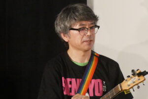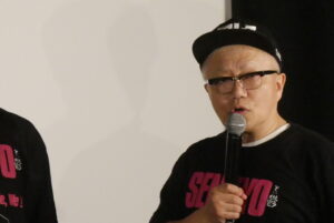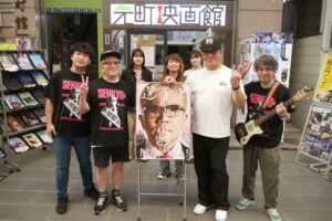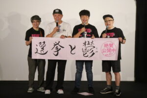 7/13(日)『選挙と鬱』上映終了後、水道橋博士、三又又三さん、原田専門家さん、青柳拓監督の舞台挨拶を開催しました。舞台挨拶は水道橋博士の選挙中に急遽結成された三又さん、原田さんによるバンド「ザ・ペニバンズ」として三又さんが歌いながら登場。三又さんが紹介する形で水道橋博士、青柳監督が壇上へ呼び込まれました。3年前の水道橋博士の選挙戦を追った本作。3年前の参議院議員選挙が終わった時点で一本の映画になるはずだったところが、水道橋博士の鬱病、議員辞職という想定外の出来事が起き、今回皆さんに観てもらった本作『選挙と鬱』の形になったと水道橋博士と青柳監督から説明。参議院議員選挙終了時点での映画の仮タイトルは『水道橋博士の選挙クエスト』というもので、その名残は現在の『選挙と鬱』にもゲーム的な演出で残っています。一人も選挙のプロがいない選挙戦は毎日のように「今日どこ行く?」から始まっていたと三又さん。「選挙をやってみようという人が見てもなんの参考にもならない」という水道橋博士の一言に会場からも笑い声が。監督の前々作にあたるコロナ禍の東京でUberEats配達員をする自身の姿を撮った『東京自転車節』以降もずっとUberの配達員を続けているという青柳監督。『選挙と鬱』の劇中に登場する配達のシーンに触れ「ずっと配達員を続けているけどあんなに怒られたことがなくて。そういう意味で博士は”持ってる”なと思った」と青柳監督。「鬱になった後、監督が会いに来てくれて嬉しかった。鬱にも個人差があるし、自分は頑張れって言われたかった」と水道橋博士。「何回でも立ち上がっても良い。そういう社会になれば良い」と不意に博士から飛び出した言葉通り、見る人を勇気づける作品になっていることを改めて感じた舞台挨拶でした。