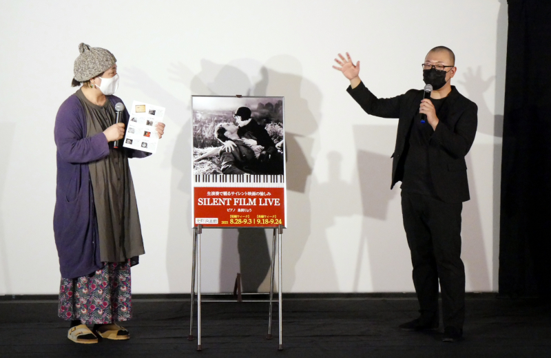 楽士・鳥飼りょうさんの即興ピアノ演奏とともにサイレント映画を愉しむ「SILENT FILM LIVE」。8月下旬から1週間開催した【短編ウィーク】に続き、9/18(土)から【長編ウィーク】がスタートしました。なんと今回は鳥飼さんのアップライトピアノを持ち込んでの開催。赤くてコンパクトでめちゃくちゃかわいいピアノにときめきが止まらない…。そして【長編ウィーク】のトップを飾ったのは、F.W.ムルナウ監督による映画史に残る傑作『サンライズ』でした。ストーリーはシンプルなれど、サスペンス、ラブロマンス、コメディ、メロドラマ…とひとつのジャンルに括れないほどその様相を変えてゆく作品に合わせ、鳥飼さんのピアノの音もどんどん表情を変えてゆきます。「作品を観てもらうためのピアノ。ピアノが前に出てはいけない」といつもお話しされる鳥飼さんですが、『サンライズ』では映画の力がとても強いため、引きすぎるとBGMのようになってしまうので並走するくらいの強度を保たないと映画と“溶け合わない”と話されました。初の生ピアノでの演奏に、お客さまからは「ステージを使ってピアノの音を響かせているのでとても良い感じだった」という感想も聞かれました。