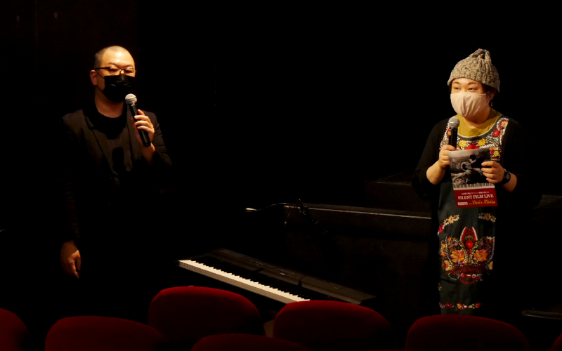SILENT FILM LIVE【短編ウィーク】、8/31(火)は発明家トマス・エジソンの会社で制作された3作品を鳥飼りょうさんのピアノ生演奏付きで上映しました。1本目は1908年の『鷲の巣から救われて』、2本目は1906年の『レアビット狂の夢』、3本目は1903年の『大列車強盗』です。通常なら制作された時代順に上映するのですが、今回はプログラムの満足度を考えてむしろ時代を遡っていくような順番にしたと鳥飼さん。『鷲の巣~』は“映画の父”と称されるD.W.グリフィスが俳優として出演しており、崖をロープで降りるというアクションにも挑んだ作品です。『レアビット狂~』は酔っぱらいの夢を描いたコメディですが、いわゆる喜劇スター登場以前の時代の作品で、俳優が体を張ったり表情で笑わせたりするものではないので、むしろ演奏によって客席の笑いが誘導されているような感覚を覚えました。しかも酩酊状態につける音も多彩で、その表現力を堪能できました。そして映画の歴史を学ぶと必ずその名が出てくる『大列車強盗』。ストーリーは複雑ではなく全編強盗らが逃げているシーンの積み重ねです。「逃げる」という表現をただ続けるだけでは単調になってしまうので、緩急をつけたりなど映画を面白く観ていただけるように演奏を工夫していると話されました。