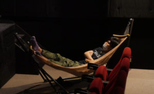『すずしい木陰』2日目の9/27(日)上映後、初日に続き守屋文雄監督のZoomを使ってのオンライン舞台挨拶を開催しました。本作の着想は、ツァイ・ミンリャン監督の『郊遊〈ピクニック〉』から得たそうです。15分ほどの長回しシーンを、苦なく「観れてしまった」ことから、じゃあどこまで可能なのか?と考え始めたら止まらなくなったのだとか。柳英里紗さんとは普段から映画の話をよくする仲で、頭から否定することなくまず受け入れてくれる人柄なので無茶と思える投げかけもしやすかったと守屋さん。どこまでが演出でどこまでがそうでないのか?ディレクションされた部分についても話は及び、もう一度観たくなりました。初日は遠巻きに見られていた“ハンモック席”も、2日目にして利用者が登場!「90分はなかなかしんどいです」という感想に、守屋監督も「そう、見た目と違って意外と負担がかかるんだよ」と同意しつつも利用を喜んでくれました。