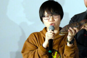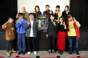 『たぶん杉沢村』4/7(土)の上映後、山口淳太監督、大歳倫弘さん(原案・脚本)、木林優太さん、松井花音さん、瀬野一至さん、黒田KC未来さん(プロデューサー)の舞台挨拶を開催しました!1日限定上映、満員のお客様の前で、まずは制作の経緯を山口監督から。8年ほど前に山口監督・大歳さんが所属するヨーロッパ企画の若手チーム(主催が大歳さん)での公演『杉沢村のアポカリプティックサウンド』をいずれ映像化したいと思い続けていたという山口監督。そんな中で本広克行監督によるオンラインサロン「本広組Creative salon FOE」製作による映画の監督の話が舞い込んできて、大歳さんが以前の脚本をベースに新に書き下ろしたのが今回の『たぶん杉沢村』となりました。キャスト・スタッフはFOEのメンバーを中心に構成、映画制作から宣伝まで幅広くのことを自分たちでやってきた作品です。俳優陣もほぼみんな映像の芝居ははじめてという中、何度も稽古を重ねたと山口監督はおっしゃられていました。木林さんは撮影当時22歳という話には会場からどよめきも起こり、終始和やかな雰囲気での舞台挨拶となりました。