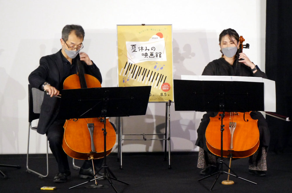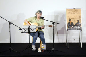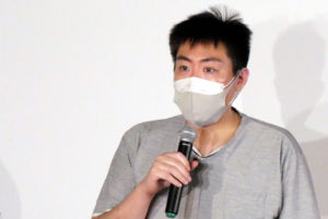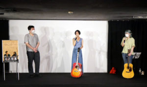 『辻占恋慕』初日の7/30(土)上映後、大野大輔監督、早織さん、ナビさんにお越しいただき、舞台挨拶とミニライブを開催しました。かねてより音楽映画を作りたいと思っていたと大野監督。プロットを作り、早織さんと会ってさらにイメージが膨らんでいったと話します。映画とは打って変わって髪をバッサリと短くして登壇された早織さんは、演じられた“月見ゆべし”は70年代のブルース&フォークシンガーをイメージし、撮影までにできるだけ髪を伸ばしたのだそう。前髪のこだわりなどもお話しくださいました。大野監督演じる“岡部”と月見ゆべしが出会った夜、ふたりが足を止める路上ライブのアーティスト役で映画初出演を果たされたナビさんは、その楽曲と声に魅了された大野監督が声をかけられて出演が決まりました。初めての映画の現場では、スタッフの多さに何より驚いたと言います。好きなセリフはあるかというお客さまからの質問に大野監督は、劇中の印象的なセリフの数々が散りばめられたポスターをじっと見つめながら長考し、「やー…、覚えてません」と答えて会場を笑わせます。会話劇の印象が強く、自身で書かれる脚本の面白さにファンも多い監督だけに意外でした。最後にはナビさん、早織さんのミニライブ。生で聴く歌声は素晴らしく感動的で、全員が聴き入っていました。