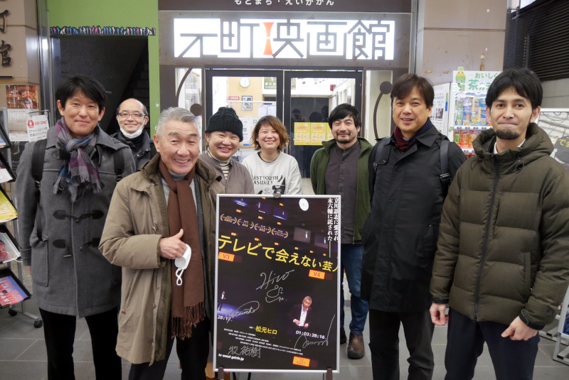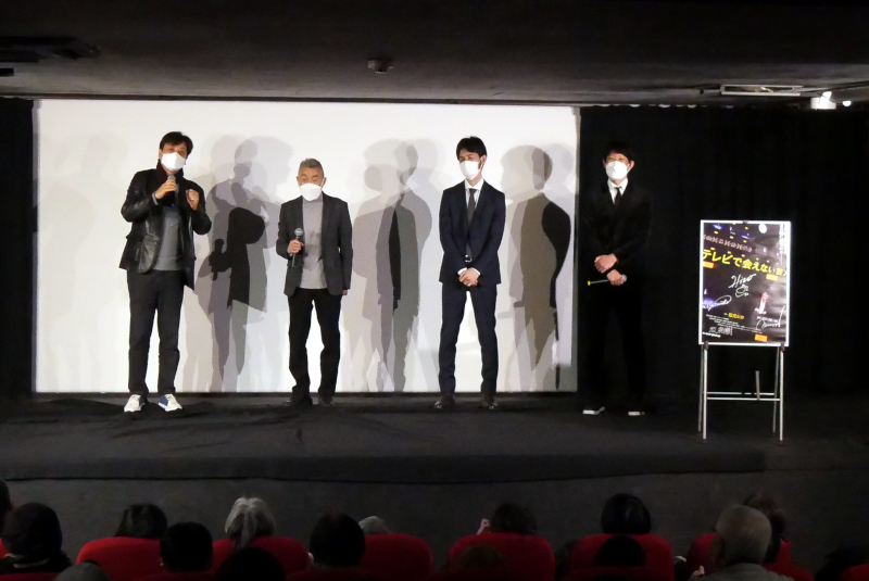 『テレビで会えない芸人』1/30(日)の上映後、松元ヒロさん、四元良隆監督、牧祐樹監督、阿武野勝彦プロデューサーにお越しいただき、舞台挨拶を開催しました。楽しみにしてくださっていた方々が朝早くからお越しくださり、久しぶりの満席となりました!「感染予防のためにみなさんをあまり笑わせないようにしますんで」と前置きされたヒロさんですが、約40分の舞台挨拶中はずっと笑いが絶えず大盛り上がりでした。“テレビで会えない”人物をテレビ局が追うということは、メディアのあり方を見つめ直すことだったと四元・牧両監督。鹿児島テレビで30分版を放送した際にはクレームが出ることを覚悟していたが、実際は一件もなかったと話されます。「7割は受け入れてくれても3割は文句を言ってくるのが健全。クレームが一件もないというのもおかしいと思う」と阿武野さん。なるほどとその視点にハッとしていると、「オレは麻生さんのネタをやるからさ、麻生さんに辞められちゃ困るわけ。とするとオレは結局麻生さんを応援してるってことになっちゃうんだよ!だからクレームが来ないんだよ」とヒロさんがすかさずネタにして返します。客席の質問も切れ間なく挙がり、次はぜひヒロさんの舞台も見に行きたいと話されるお客さまも多くいらっしゃいました。
