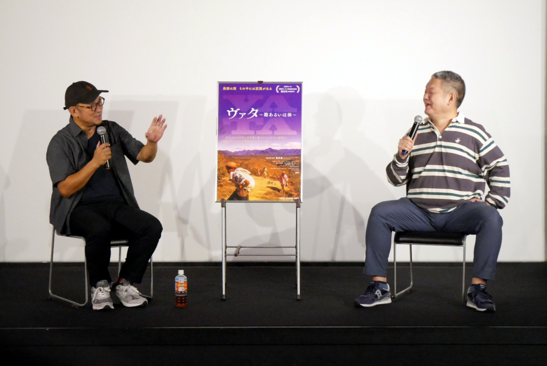 『ヴァタ ~箱あるいは体~』10/7(月)上映後、亀井岳監督の舞台挨拶を開催しました。亀井監督は10代後半からその音楽に魅かれたという“マダガスカル音楽マニア”。映画監督としても前作『ギターマダガスカル』そして本作と、マダガスカルを舞台に作品を制作しています。淡路島くらいの小さな島だと思われていることも多いのですが、実は日本全土の1.6倍ある大きな島国で、インドネシアなどのアジアがルーツであることから、アフリカ大陸の国々よりも親しみやすく居心地が良いと感じる場所だと亀井監督。その音楽にハマったのも、アジア的な和音などの“調和”に魅力を感じたことがきっかけだったそうです。この夏に訪れたというお客さまもいらっしゃいました。