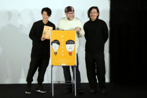 『わかりません』1/14(土)初日の上映後、ボブ鈴木さん、木原勝利さん、片山享監督の舞台挨拶を開催しました。本作は3人が役者として所属する事務所ハイエンド製作の劇場用映画第一弾として製作されました。コロナ禍が始まった頃に役者としての仕事が一旦ストップし、事務所の代表と片山監督が「何かをやろう!」という話をする中で、片山監督とは20年来の付き合いでもあるボブ鈴木さん主演での映画制作の企画が持ち上がったそうです。最初は短編映画として脚本が出来上がり、撮影が始まったそうですが今回お客さまに見ていただいた長編の本作にもあるクライマックスのボブ鈴木さん木原勝利さんのシーンを撮影している時に、この映画に出てくる役者・木原勝利の人生を知りたくなったと片山監督。ボブさん、木原さん共に本人役を演じているのがこの作品。このシーンの撮影が終わってすぐに片山監督は木原さんにそのことを伝えたそうです(木原さんは「なに言うてんねん!」と思ったそう)。そうして出来上がった長編の本作は時に辛く苦しくもあり、もがく姿がもはや笑いにすらなる二人の”おじさん”の人生讃歌とも言えるのではないでしょうか。